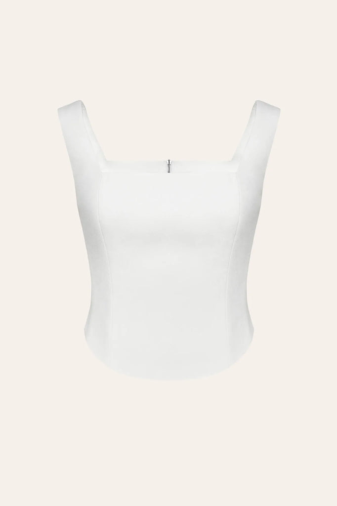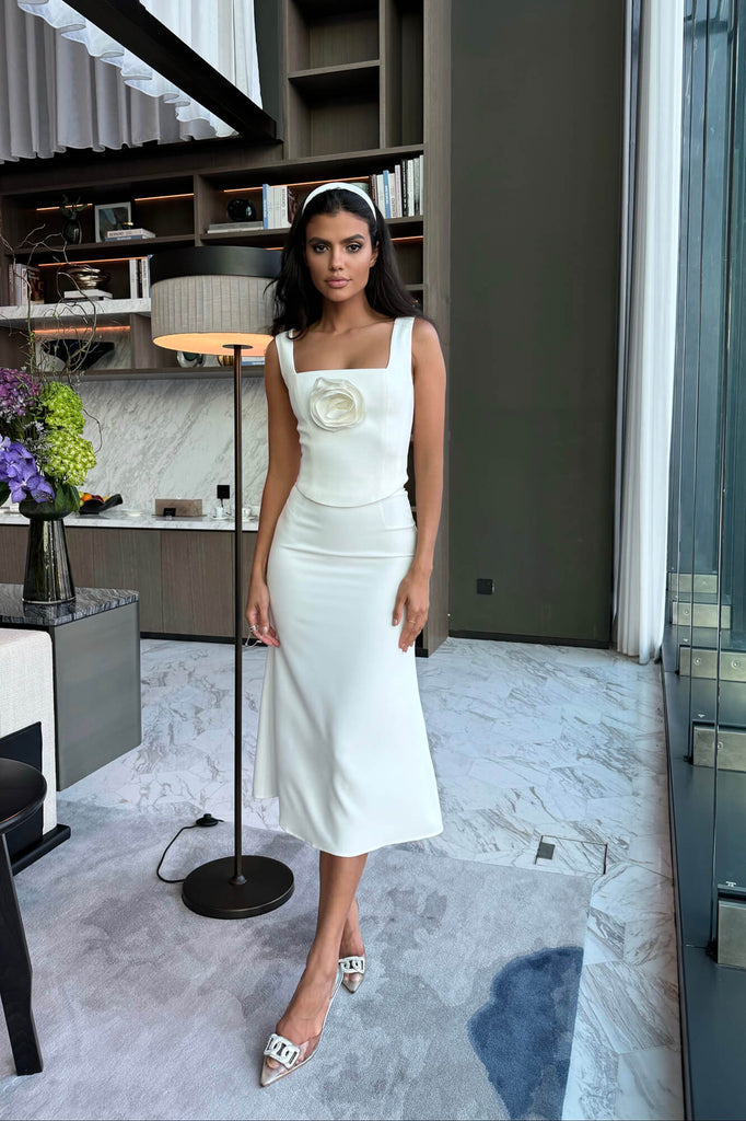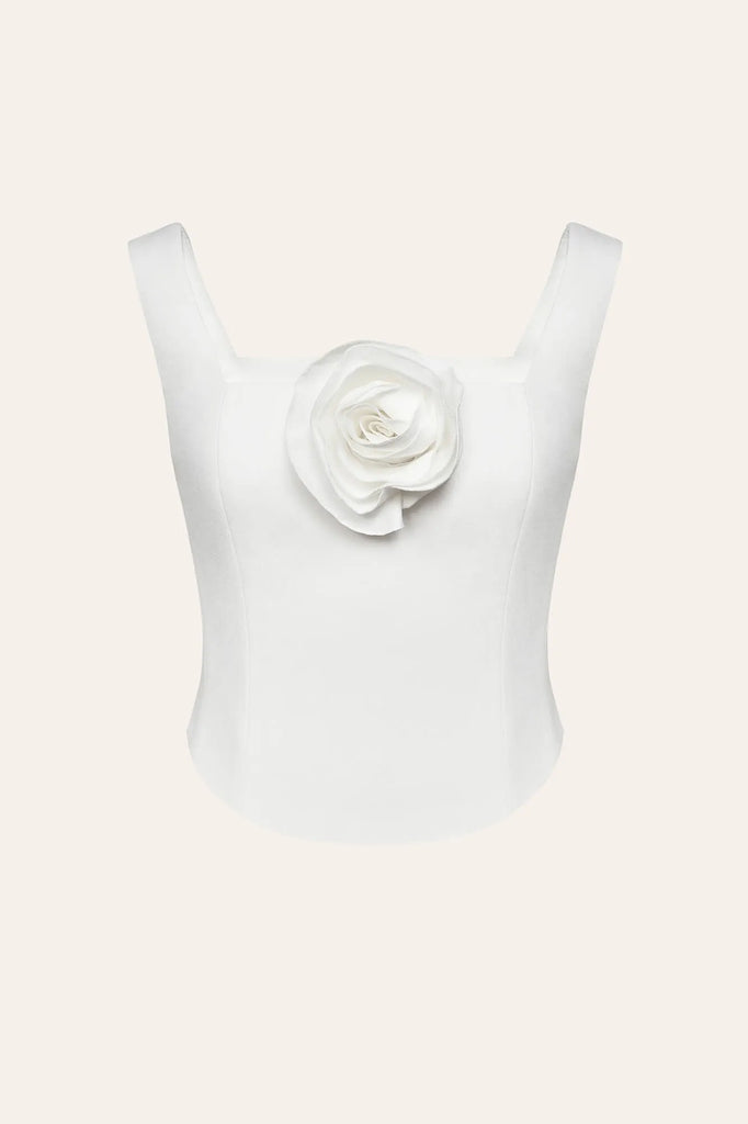 A crop top in milk with a square neckline and wide straps. Removable rose decor add tenderness and romance to the look. Fits perfectly to the bodyshape. Mix it with High Waisted Trousers or Midi Skirts. Lined.