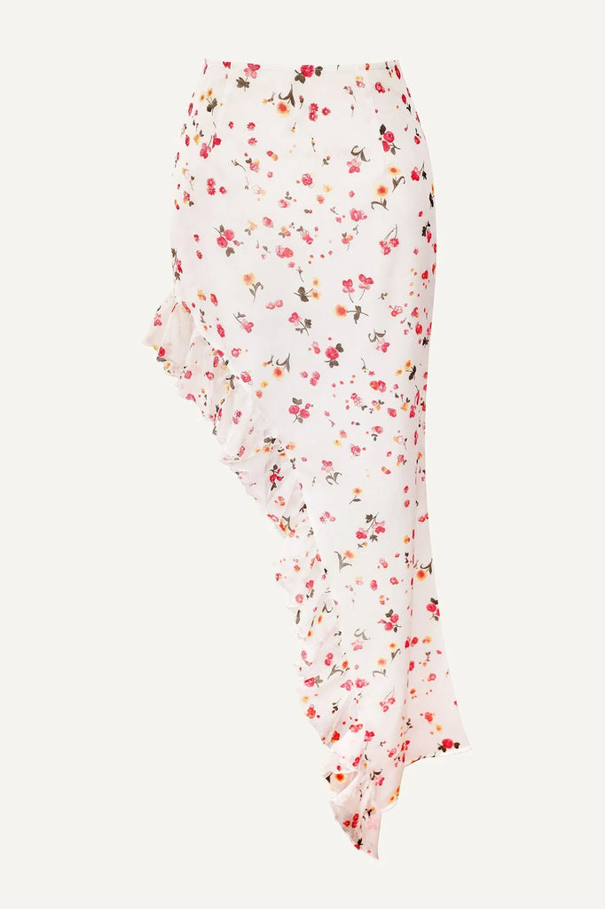 An asymmetrical skirt with a flounce trim will make your look delicate and airy, and a floral print will add even more romance and femininity.