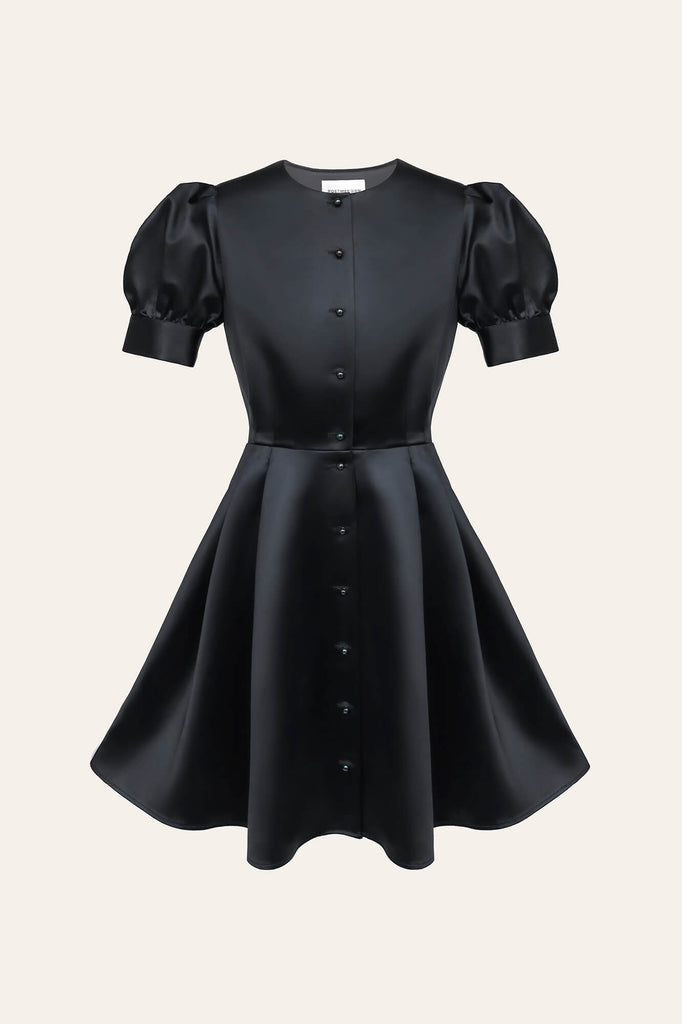 An exquisite mini dress with a fluffy skirt. The material of satin in black and the lantern sleeves make this dress really sumptuous. The waist line favorably emphasizes the silhouette while the fluffy skirt creates lightness. Fastened with buttons.