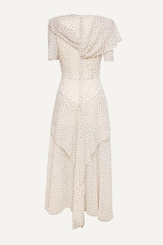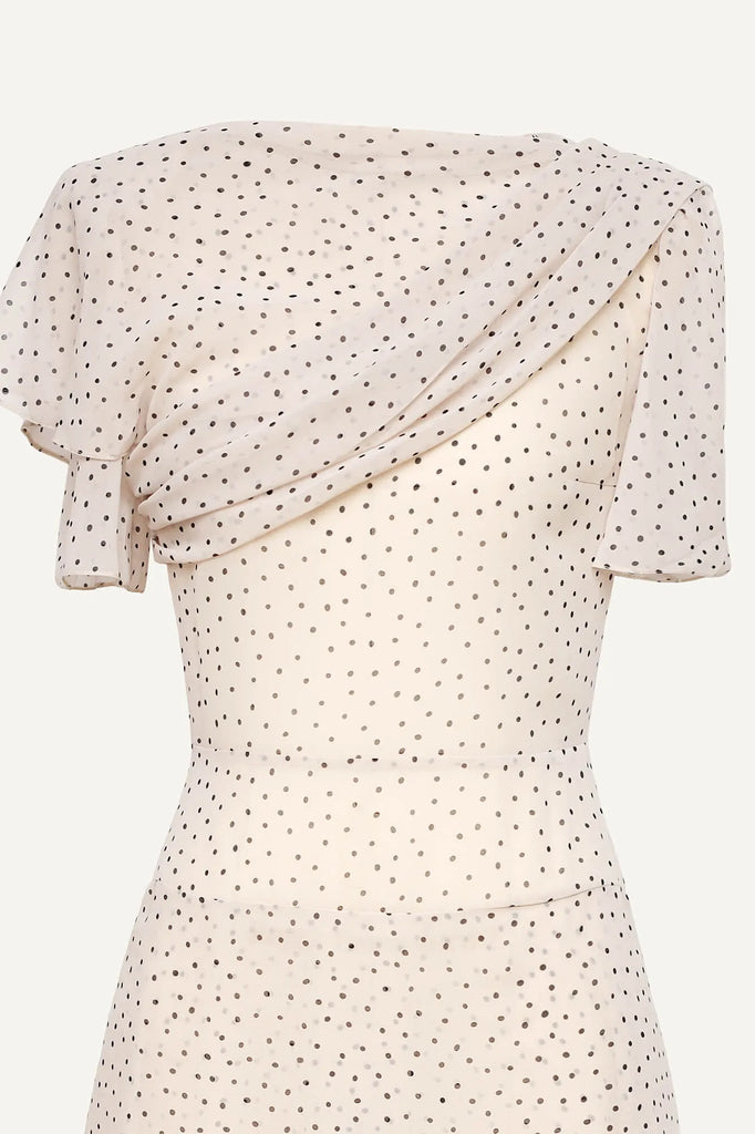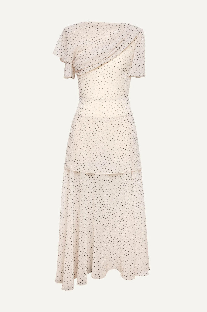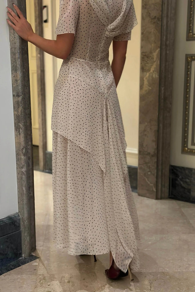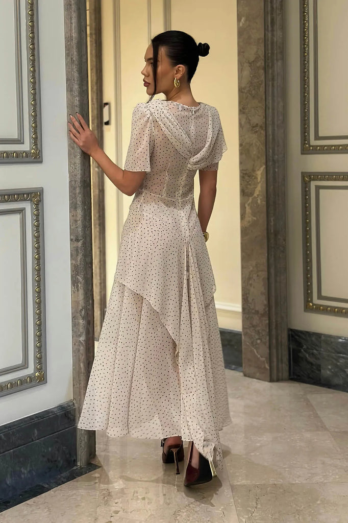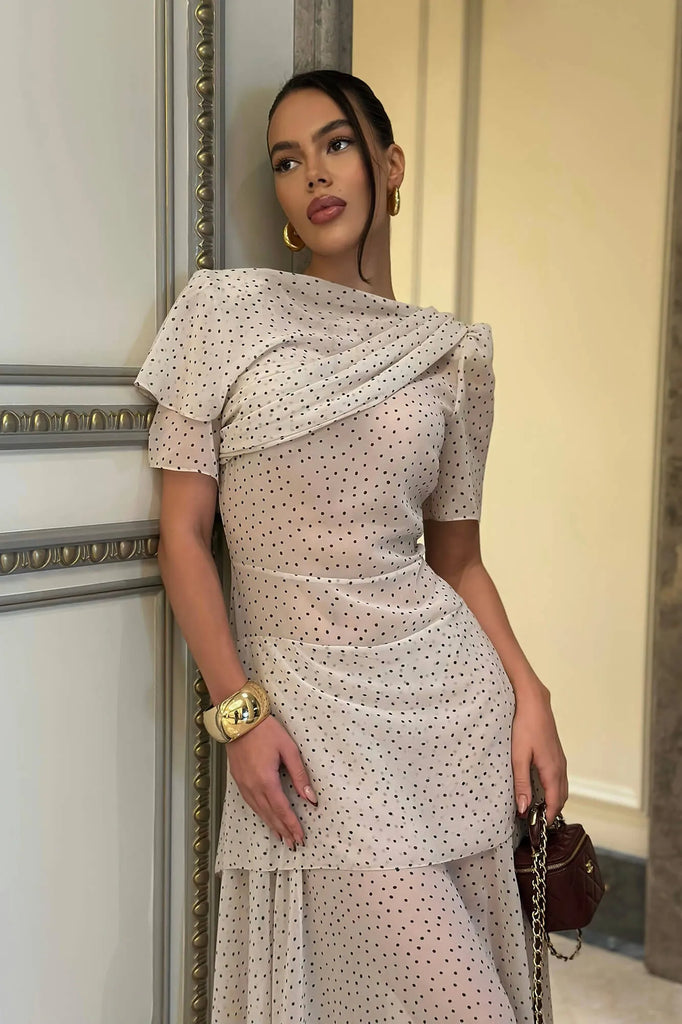 A midi dress of flowing, weightless chiffon with an asymmetrical cut, double skirt, and delicate draping—a manifesto of femininity, passion, and mystery, standing among the season’s defining trends. Concealed yet intoxicatingly sensual. The diaphanous fabric skims the silhouette, teasing the imagination, while the soft folds whisper of hidden allure.