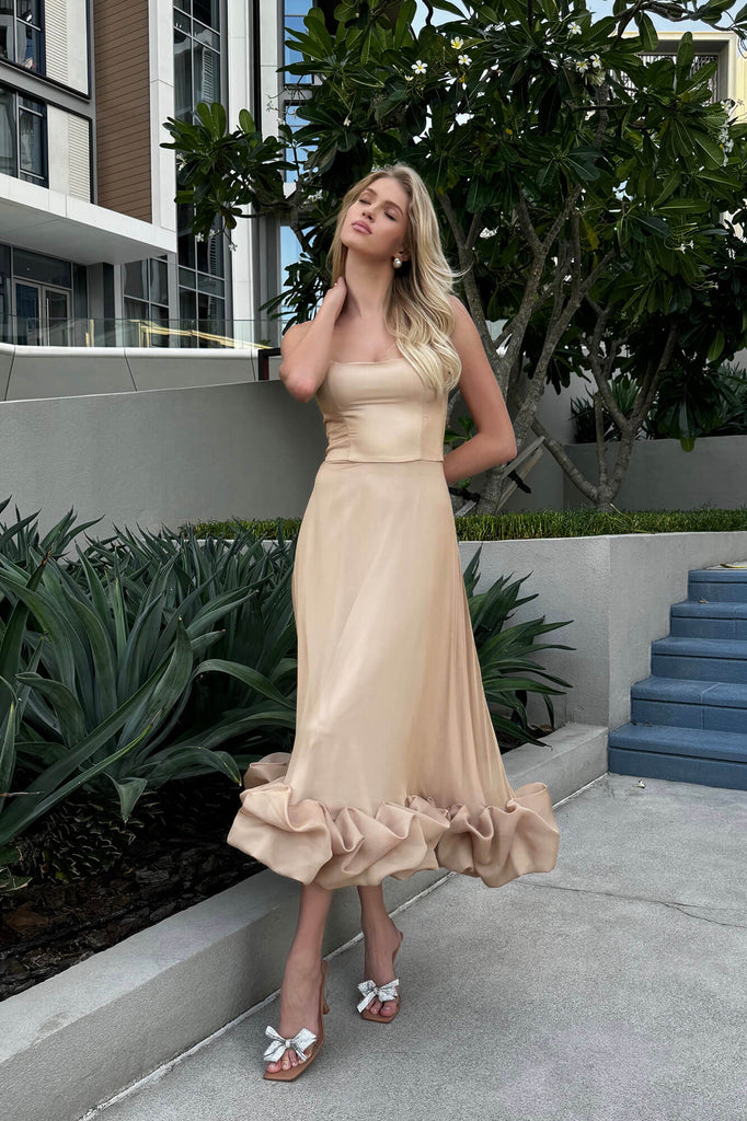 Flounce Bustier Midi Dress in Gold. The corset with bones and cups flatters the body shape while the flounce in the bottom creates a dreamy and romantic feel. The dress fastens with a hidden zipper. Lined.