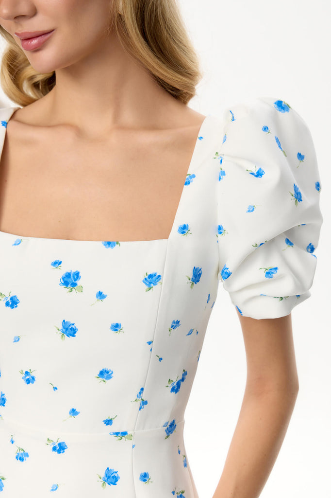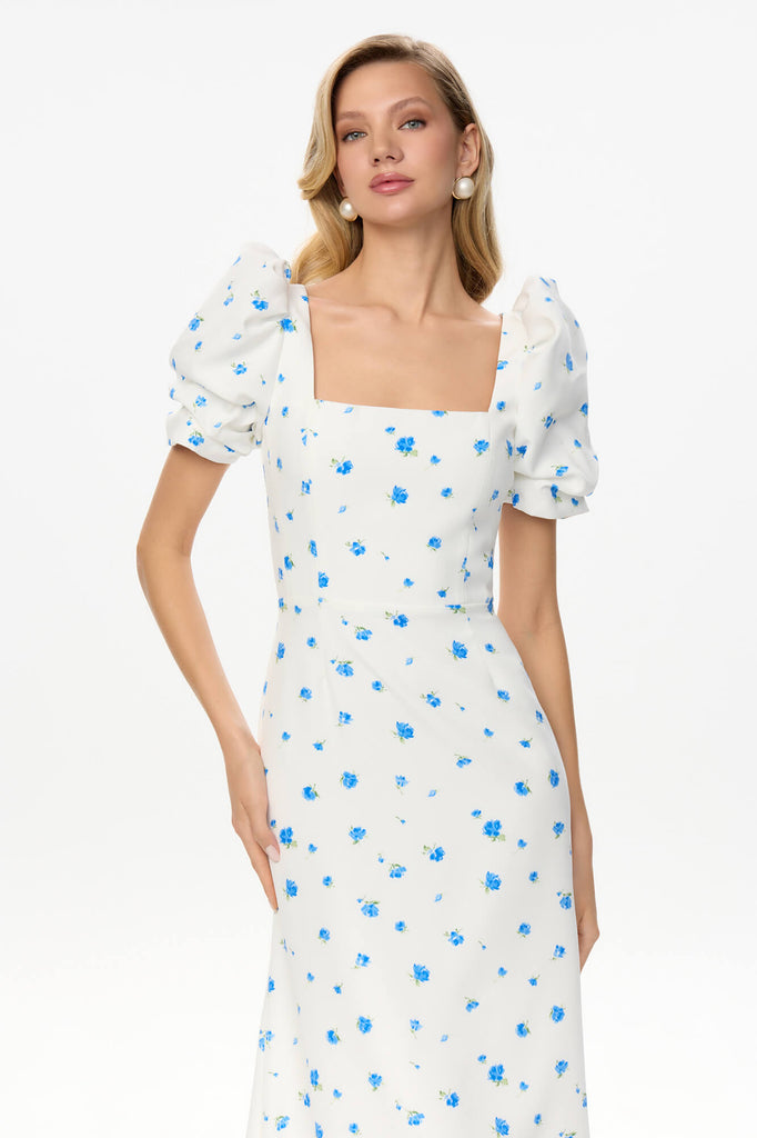 Tea party in the garden with the closests. This silhouette midi dress in Blue with a godet skirt and lovely print is for those who opt for a classy look but want to add a little zest while keeping it minimalistic. Trendy square neck makes the appearance elegant and short sleeves make this garment perfect to be your lovely summer outfit. Lined.