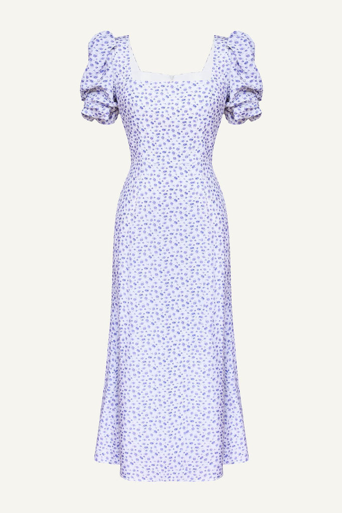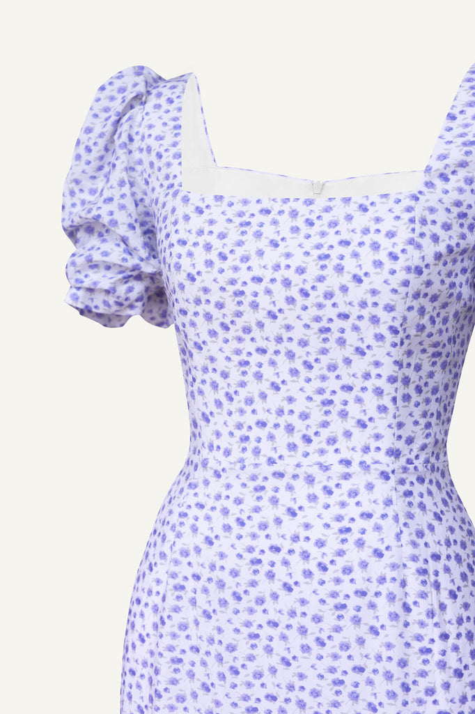 Tea party in the garden with the closests. This silhouette midi dress in Lilac with a godet skirt is for those who opt for a classy look but want to add a little zest while keeping it minimalistic. Trendy square neck makes the appearance elegant and short sleeves make this garment perfect to be your lovely summer outfit. Lined.