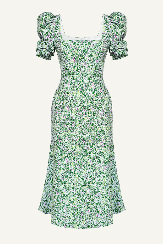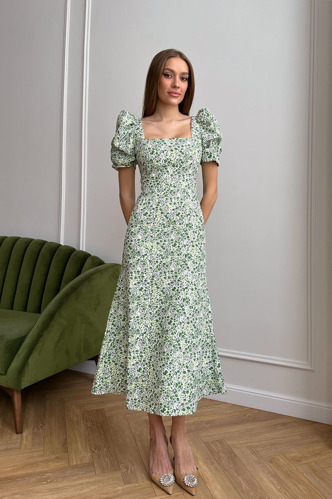 Discover a fresh style for casual wear. This silhouetted midi dress in Green with a godet skirt and lovely print is for those who opt for a classy look but want to add a little zest while keeping it minimalistic. Trendy square neck makes the appearance elegant and short sleeves make this garment perfect to be your lovely summer outfit. Lined.