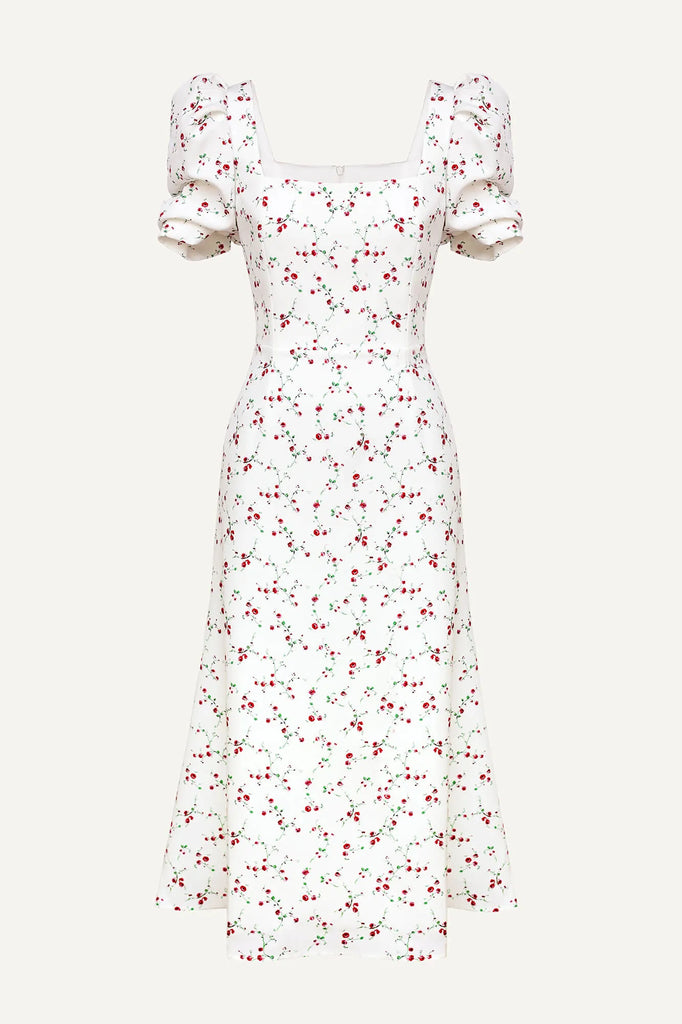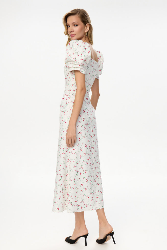 Tea party in the garden with the closests. This silhouette midi dress in Raspberries with a godet skirt is for those who opt for a classy look but want to add a little zest while keeping it minimalistic. Trendy square neck makes the appearance elegant and short sleeves make this garment perfect to be your lovely summer outfit. Lined.