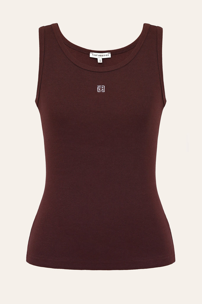 A chocolate ribbed stretch tank top with wide straps and a round neckline is an essential wardrobe grament. Pair it with your favorite jeans and a blazer for a chic daytime look, or with a flowy skirt and heels for a stylish evening ensemble.