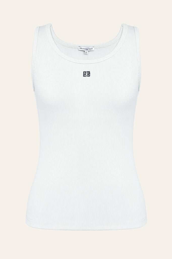 A white ribbed stretch tank top with wide straps and a round neckline is an essential wardrobe grament. Pair it with your favorite jeans and a blazer for a chic daytime look, or with a flowy skirt and heels for a stylish evening ensemble.