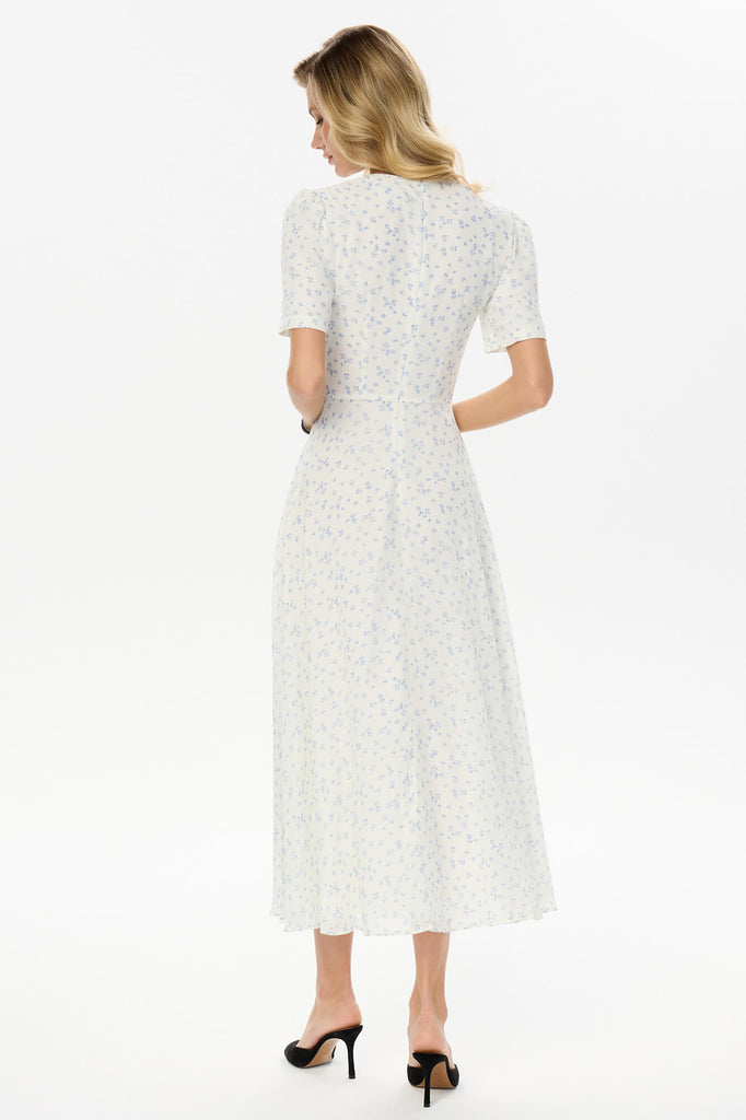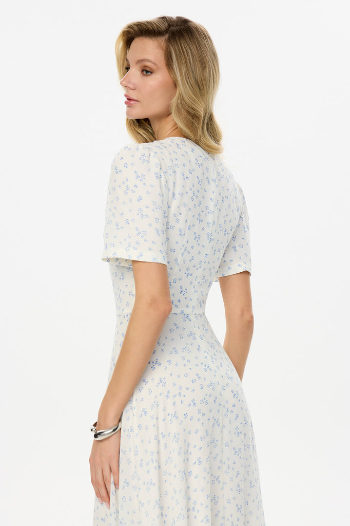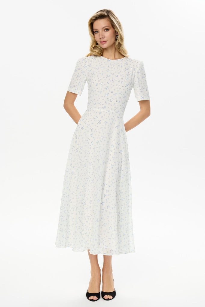 Double layer chiffon Floral Midi Dress with short sleeves. A flying sun skirt will make your look airy and delicate while the print featuring blossoms will add vivid accents. This crewneck classic silhouetted dress will defenitely become a piece of your casual summer wardrobe. Lined. Inivisible Zip Fastener.