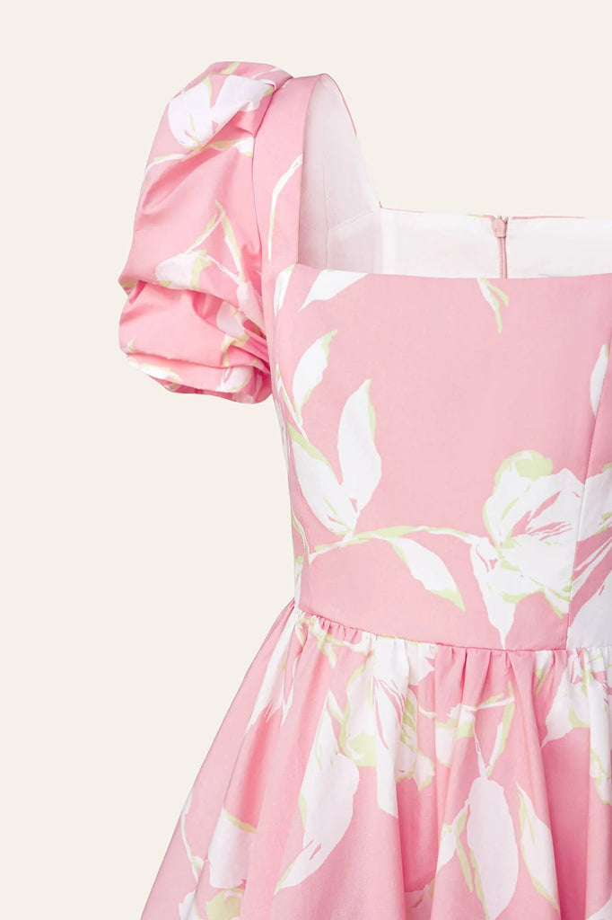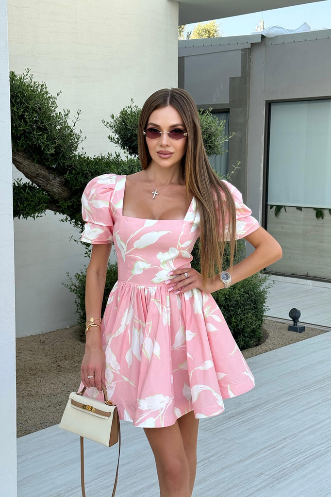A mini-length dress in pink with puffy draped sleeves. Delicate floral print. The square neckline highlights the neckline and visually lengthens the neck. A full skirt gives a feeling of playfulness and romance. A light and airy summer dress. Wear with both minimalistic pumps and sandals.