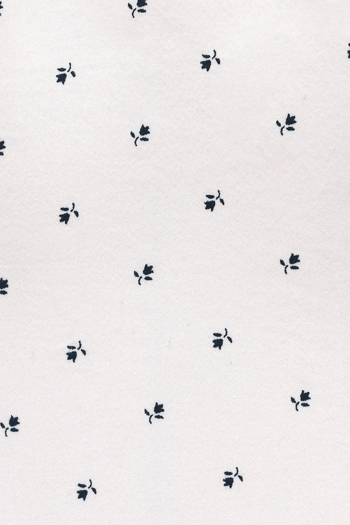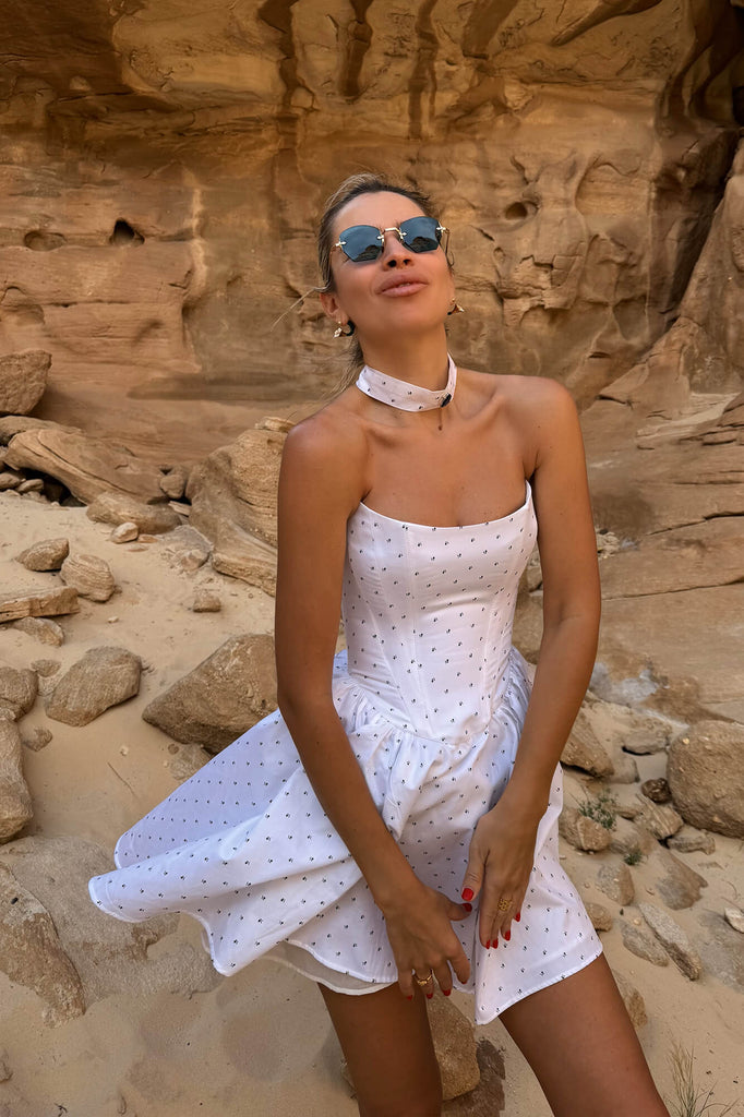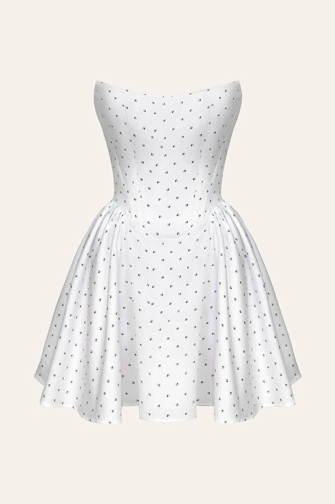 A Bustier Mini Dress with a figured corset in white. Contrasting floral print. A feminine full skirt. The inner design of the bodice has underwire bones. Lined.