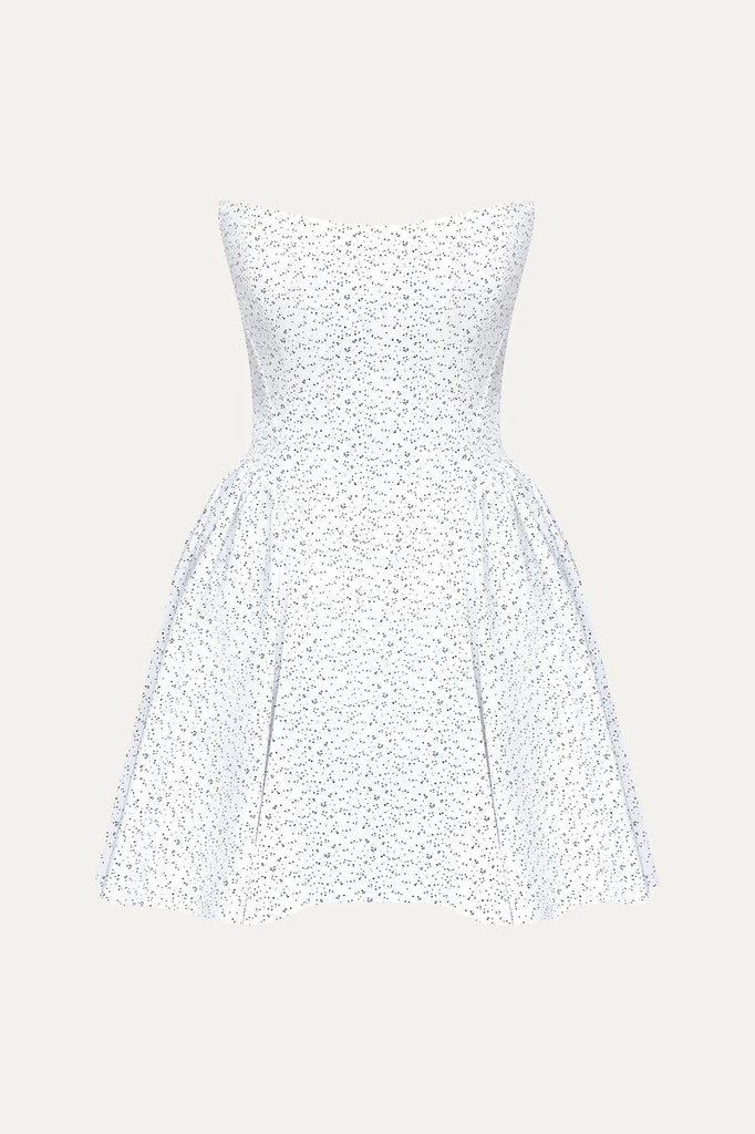 Bustier Mini Dress with a figured corset in milk. A feminine full skirt. The inner design of the bodice has underwire bones. Lined.