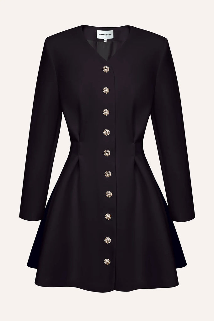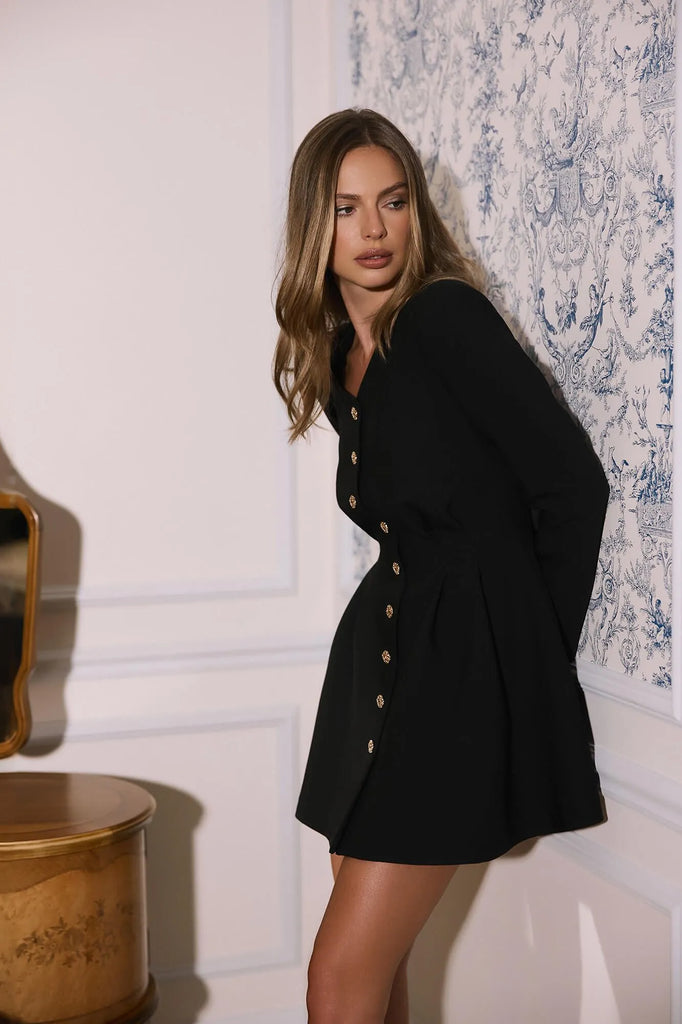 Experience timeless elegance in this exquisitely crafted black mini dress. The minimalist design, fitted bodice, and V-neckline create a flattering silhouette. Subtle metallic button detailing adds a touch of glamour, while the flared skirt provides a touch of playful femininity, making it ideal for special occasions and evening events.