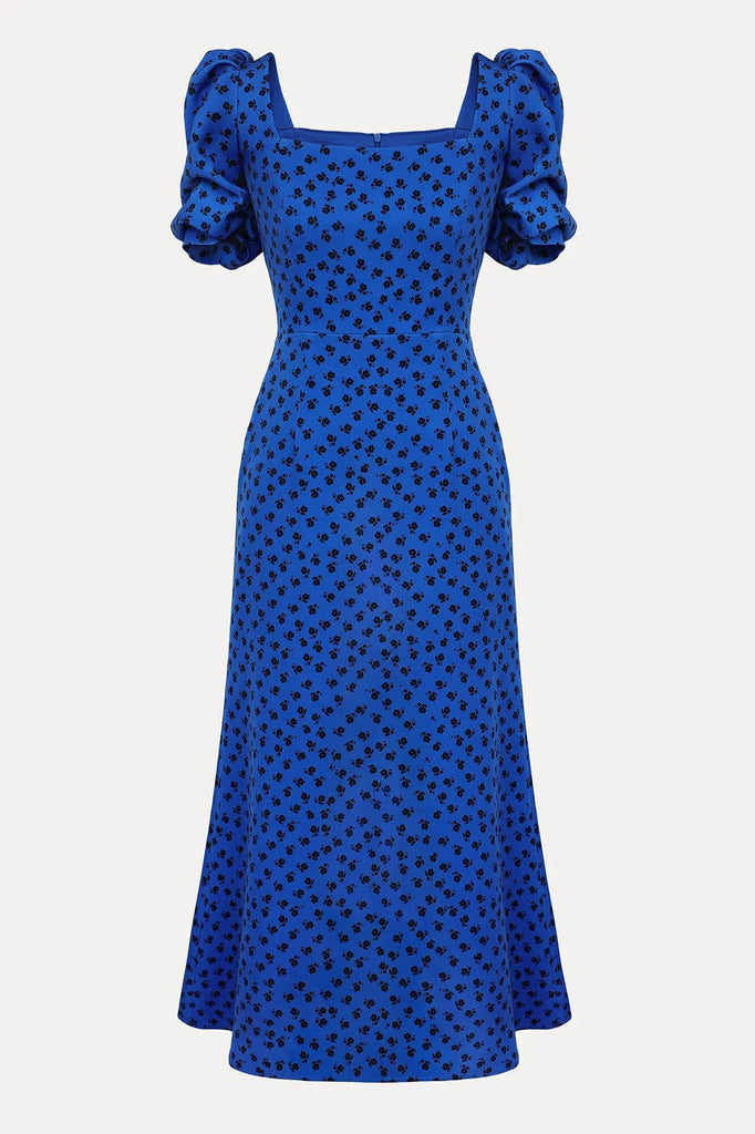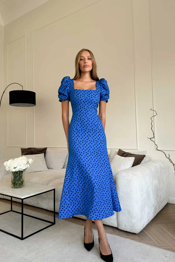 Tea party in the garden with the closests. This silhouette midi dress in Electric with a godet skirt is for those who opt for a classy look but want to add a little zest while keeping it minimalistic. Trendy square neck makes the appearance elegant and short sleeves make this garment perfect to be your lovely summer outfit. Lined.