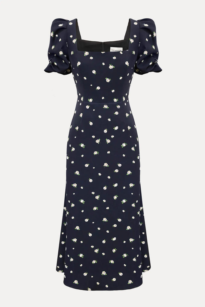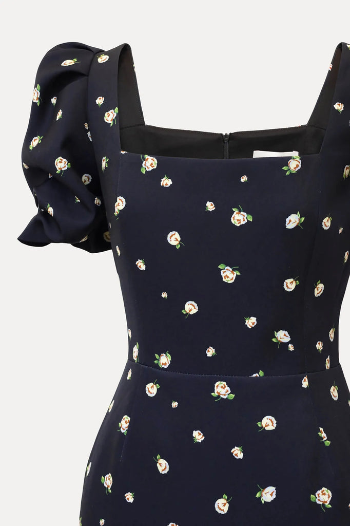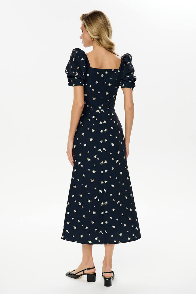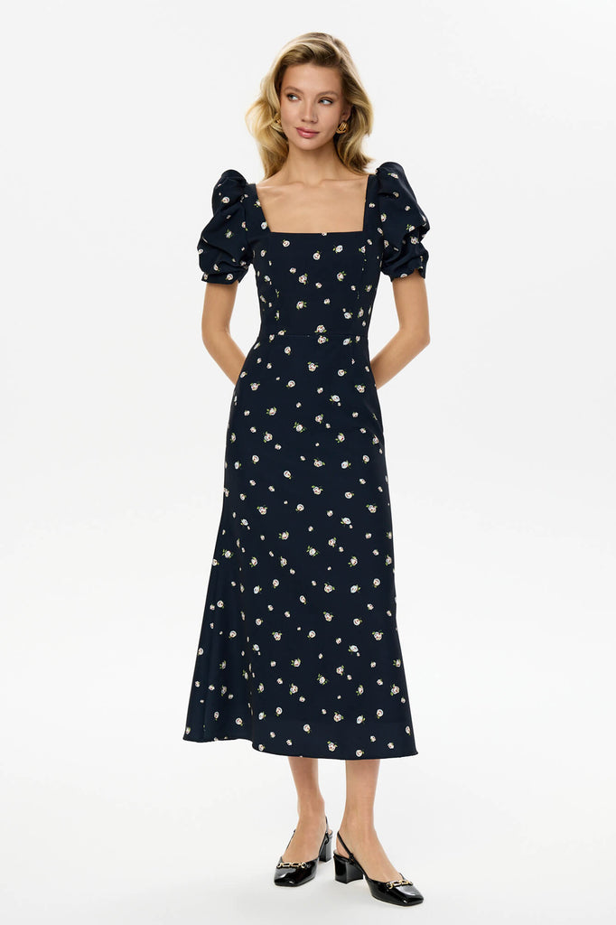 Tea party in the garden with the closests. This silhouette midi dress in Dark Blue with a godet skirt and lovely rose print is for those who opt for a classy look but want to add a little zest while keeping it minimalistic. Trendy square neck makes the appearance elegant and short sleeves make this garment perfect to be your lovely summer outfit. Lined.