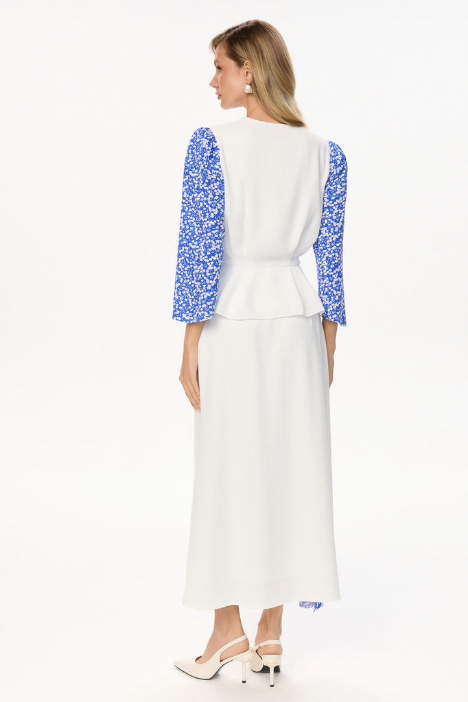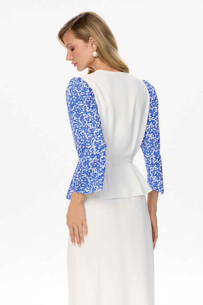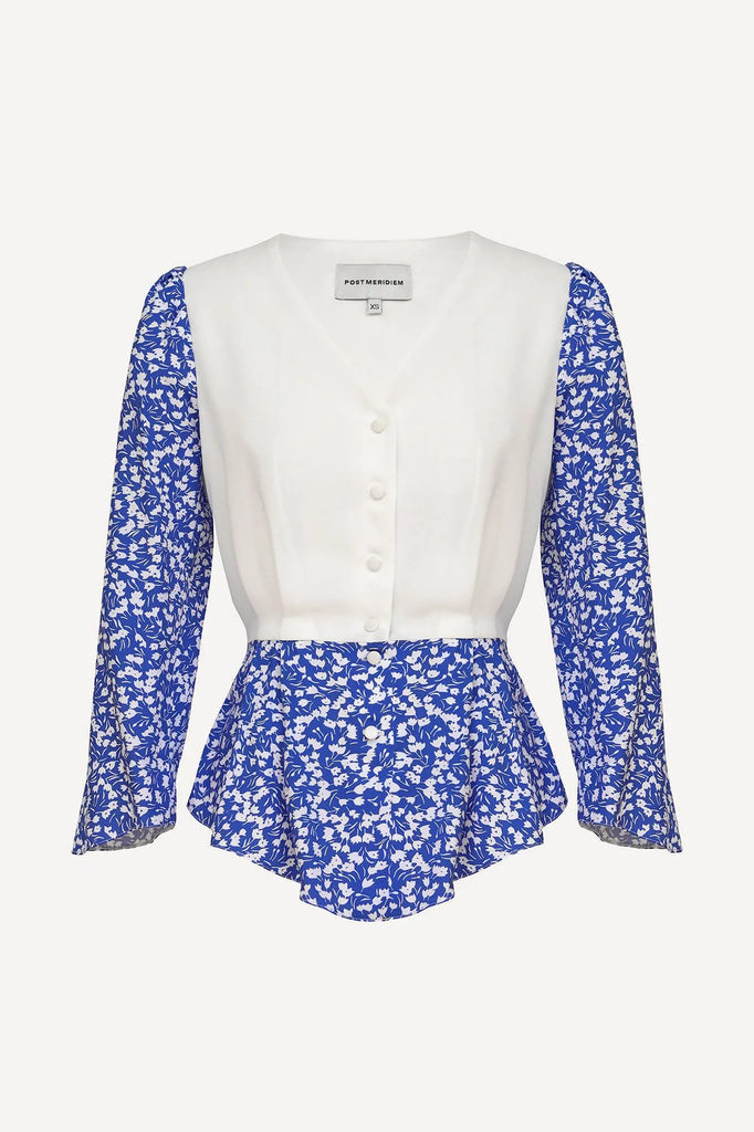 A soft blue blouse with a floral print on the sleeves and peplum adds a touch of romanticism to any outfit. The 3/4 sleeves are flattering and versatile, while the deep V-neckline elongates the neck. The peplum adds a feminine touch and creates a flattering silhouette. Pair it with a skirt in a matching colour for a sophisticated look.