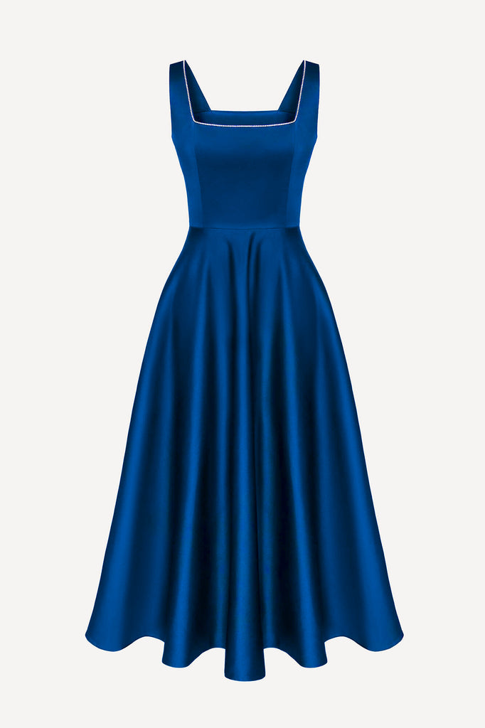 Chic and elegant midi length dress with wide straps in Electrician. The neckline decorated with rhinestones makes the dress really special. Will fit nicely to every body shape. Invisible Zip Fastener.