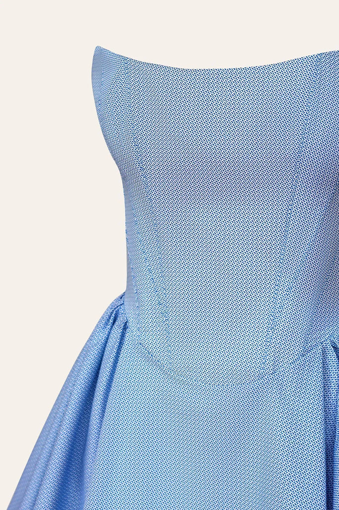 Bustier Mini Dress with a figured corset in blue. A feminine full skirt. The inner design of the bodice has underwire bones. Lined.