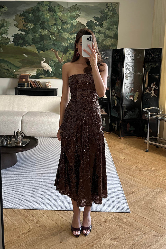 Double layered sequin midi dress in chocolate color. Velvet ribbons with ties on the back model a corset frame and accentuate the silhouette lines. The translucent sparkling fabric of the upper skirt effectively flows and shimmers when moving, emphasizing the graceful legs of the magical dress' wearer.