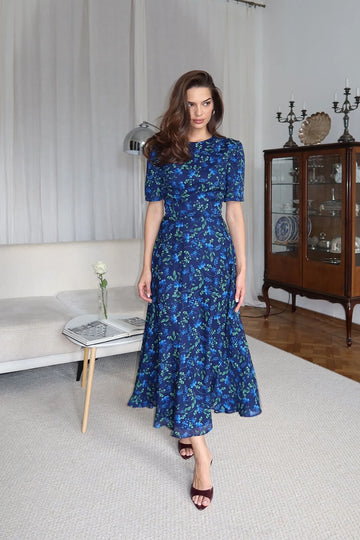 Double layer chiffon Floral Midi Dress with short sleeves. A flying sun skirt will make your look airy and delicate while the print featuring blossoms will add vivid accents. This crewneck classic silhouetted dress will defenitely become a piece of your casual summer wardrobe. Lined. Inivisible Zip Fastener.