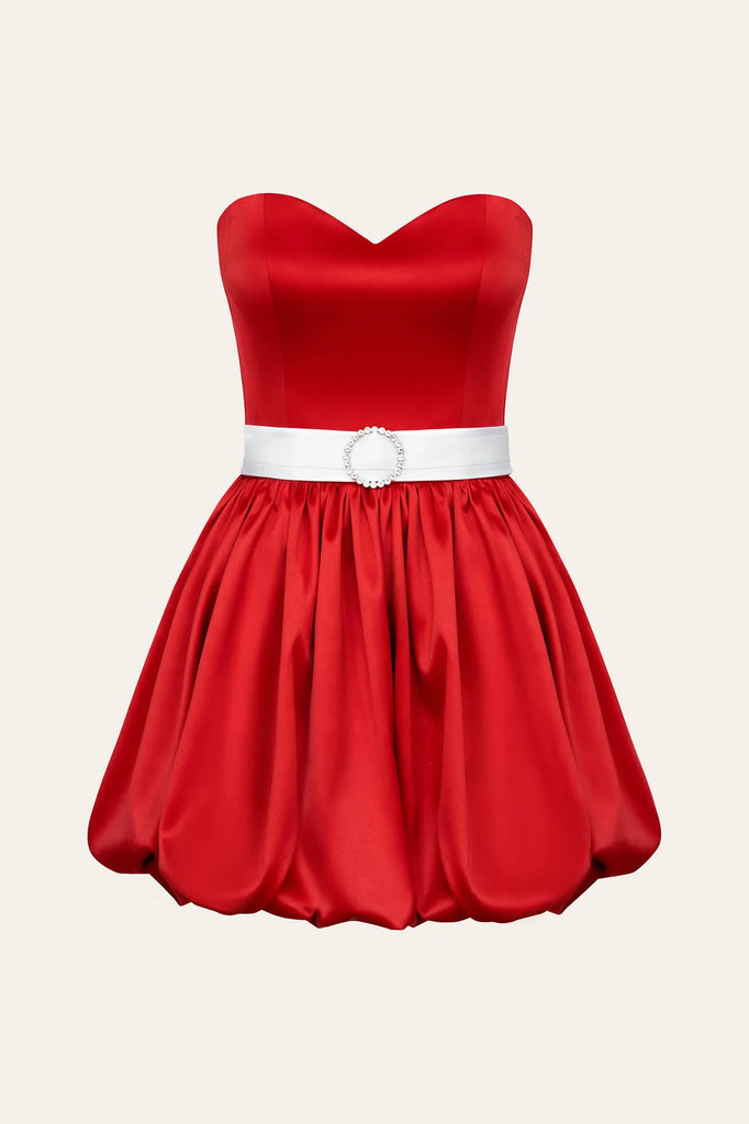 A satin sweetheart neckline dress in flaming red with a voluminous draped mini skirt. The corset bodice provides a perfect fit and emphasizes the figure, while a contrasting belt with a rhinestone buckle accentuates the waistline and makes the look more festive.