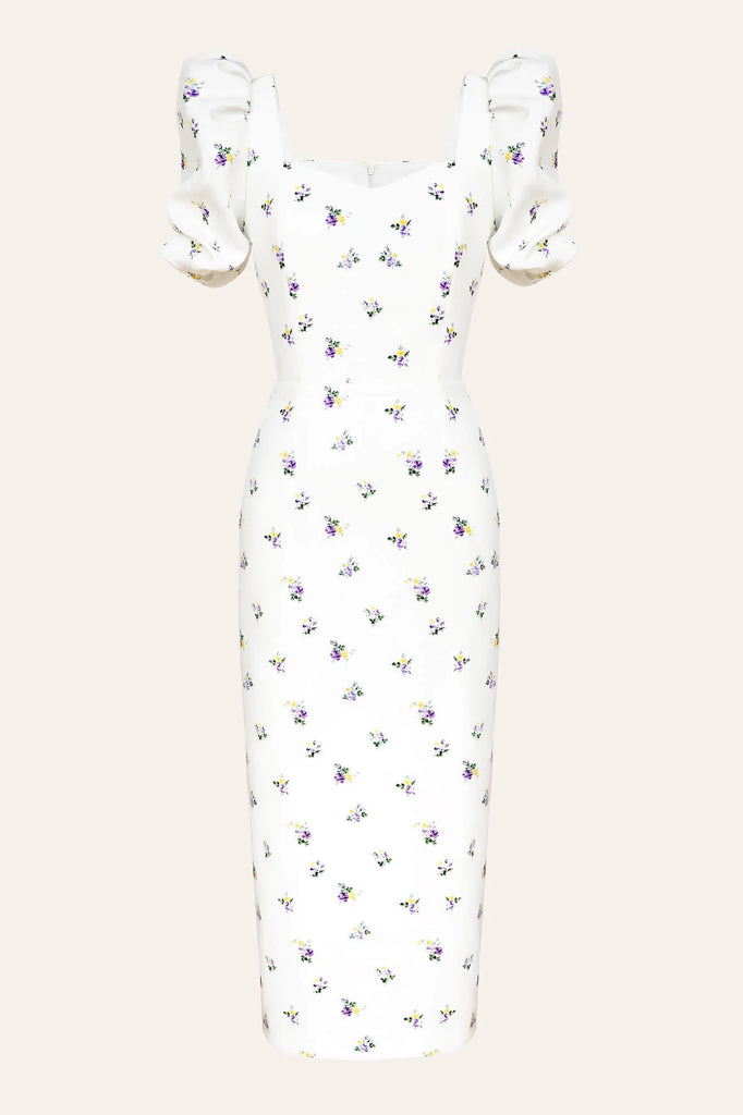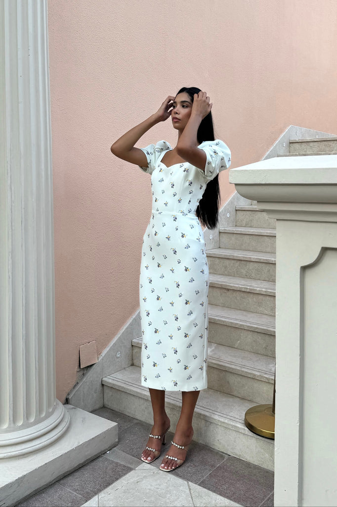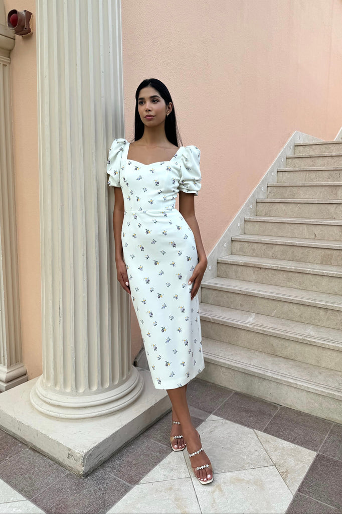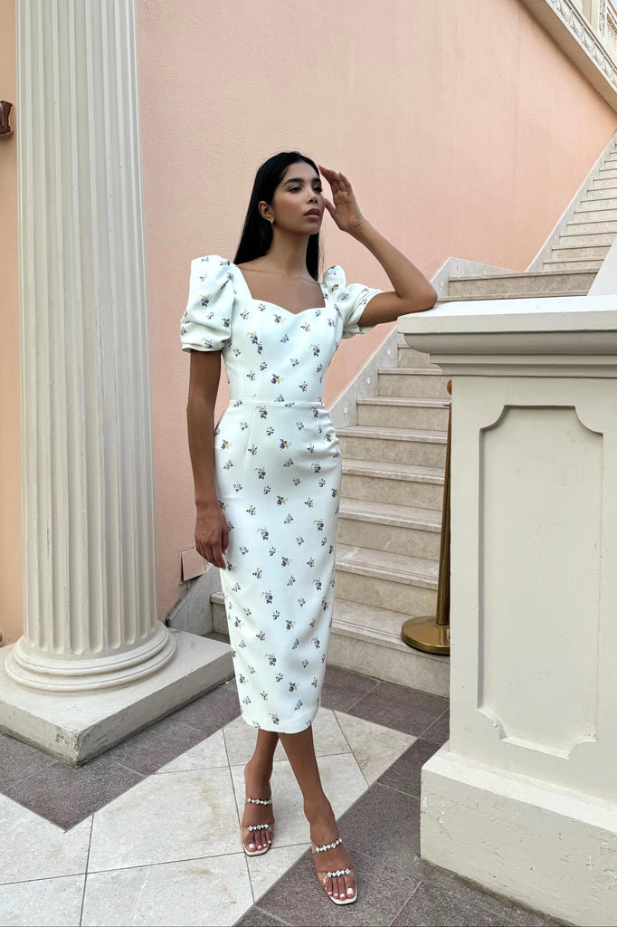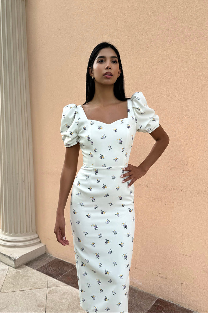 A midi length dress with puffy sleeves. Delicate floral print. A curly neckline highlights the neck and collarbones area. A delicate square neckline on the back adds a feeling of romance. Enjoy elegant and sophisticated look due to straight slit skirt.