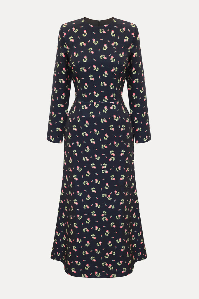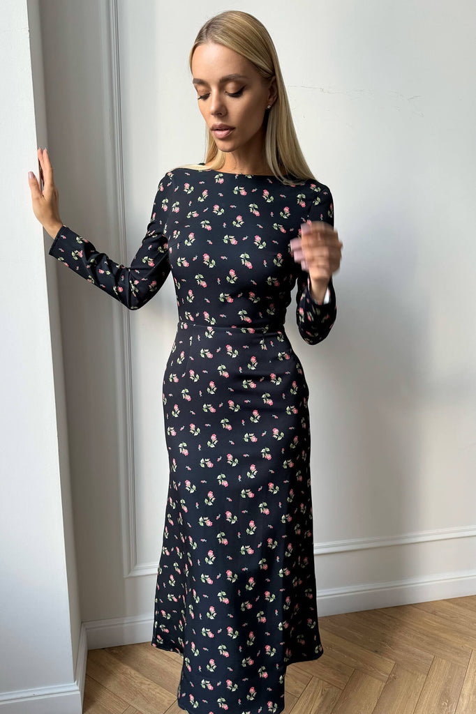 This silhouette midi dress with a godet skirt and flower pattern is for those who opt for a classy look, but want to add a little zest while keeping it minimalistic. Long set-in sleeves smoothly fit the shoulder. Lined.