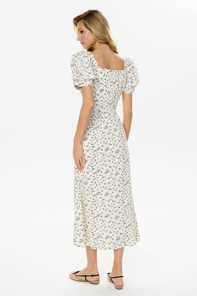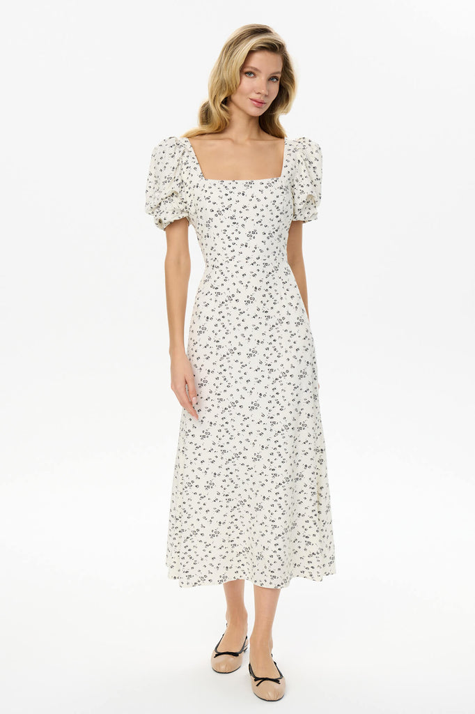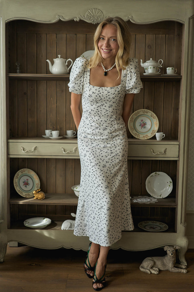 Tea party in the garden with the closests. This silhouette midi dress in Ivory with a godet skirt is for those who opt for a classy look but want to add a little zest while keeping it minimalistic. Trendy square neck makes the appearance elegant and short sleeves make this garment perfect to be your lovely summer outfit. Lined.