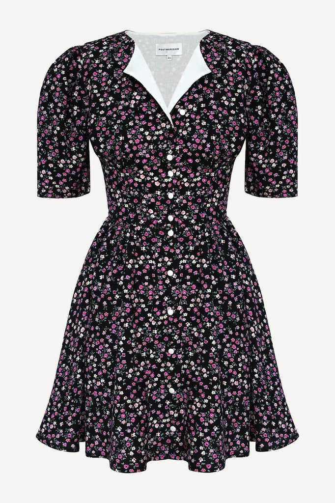 A button-down mini dress with a vibrant floral print. This flattering dress features a fitted silhouette, billowing sleeves, and a flowing skirt for a breezy and feminine look. Adjust the neckline depending on your mood.