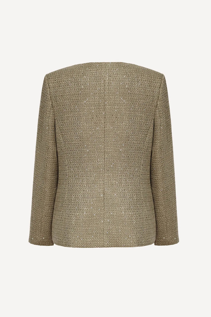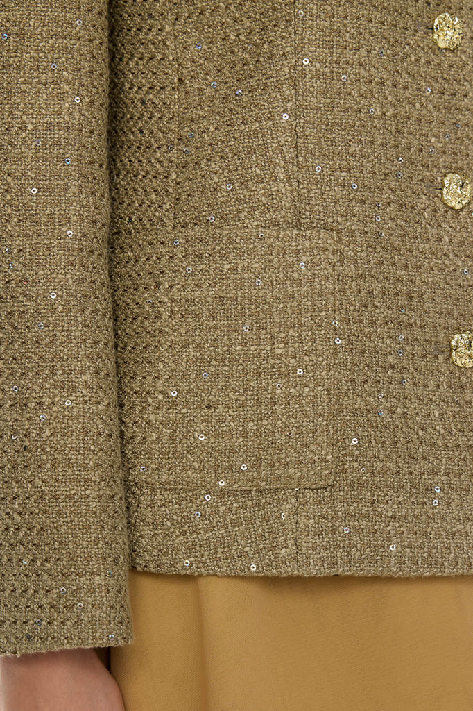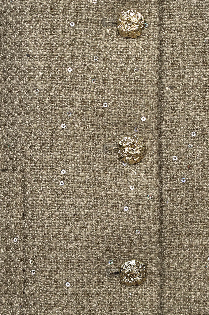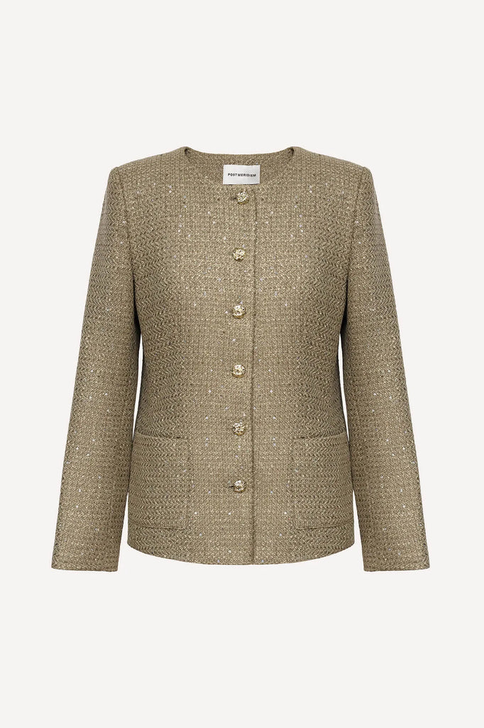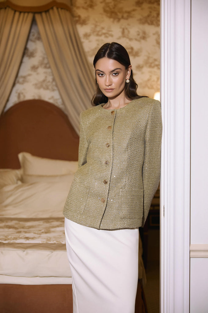 A straight-cut, collarless jacket with a round neckline, crafted in a sophisticated golden palette. Its clean lines and minimalist design create an effortlessly elegant and feminine silhouette. The decorative buttons and subtle metallic threading add a refined touch of luxury and sparkle, making it perfect for both daytime polish and evening allure.
