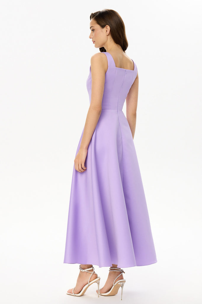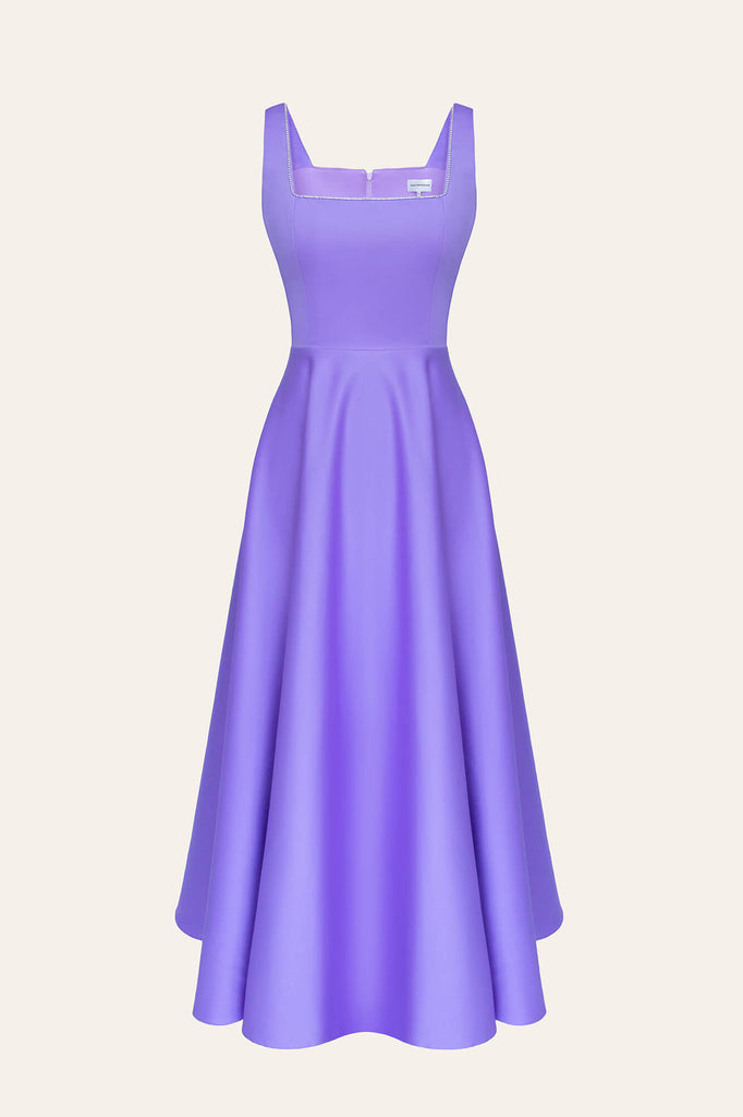 Chic and elegant midi length dress with wide straps in lavender. The neckline decorated with rhinestones makes the dress really special. Will fit nicely to every body shape. Invisible Zip Fastener.