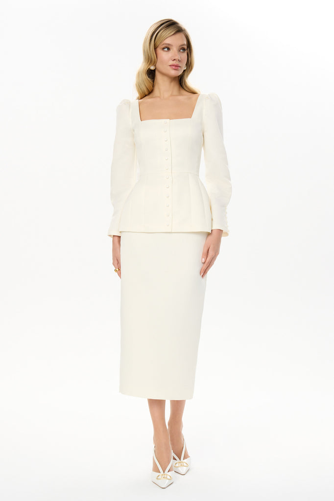 This opulent milk satin top exudes elegance. The square neckline beautifully showcases the décolletage and collarbones, while the long, voluminous sleeves add a touch of drama and sophistication. A fitted silhouette with a peplum and contrasting buttons completes the refined look, ideal for special occasions. Pair with a matching satin pencil skirt for a truly luxurious ensemble.