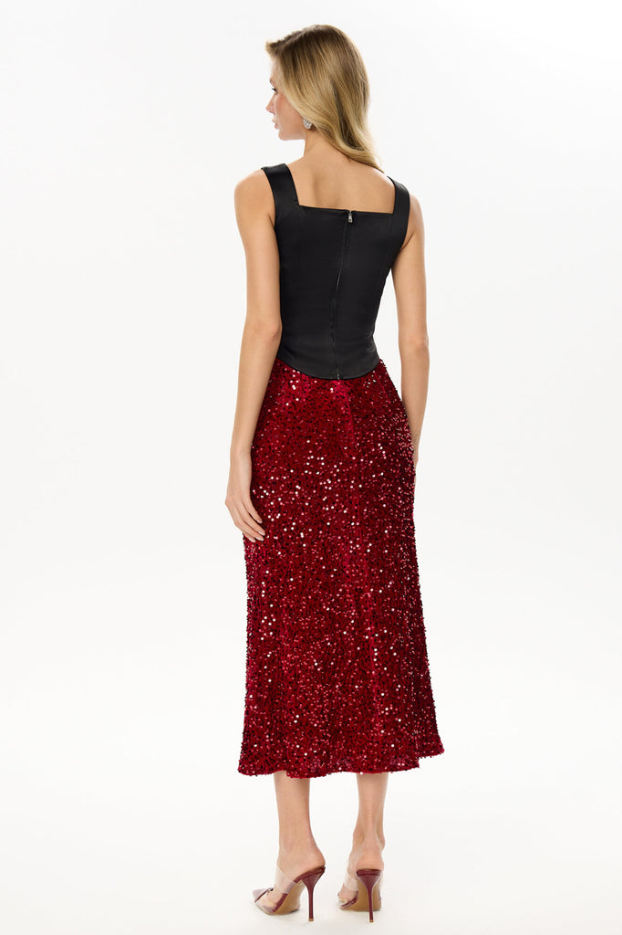 Godet skirt in midi length in Vinous color. Fitted silhouette flares downwards. Sequins embroidered sparkling fabric looks spectacular and luxurious. Invisible zipper fastener.