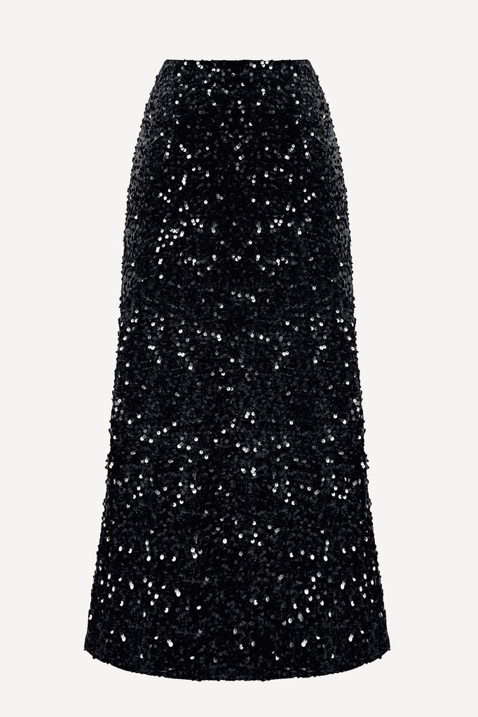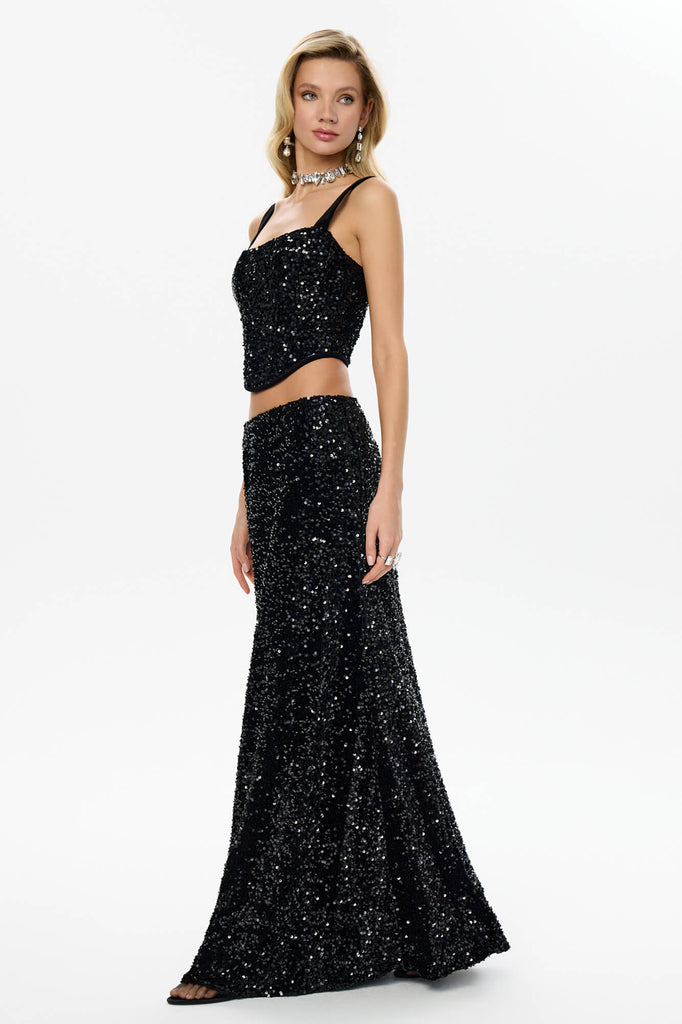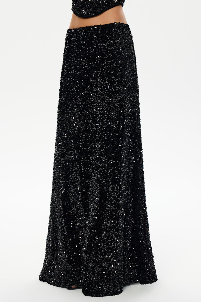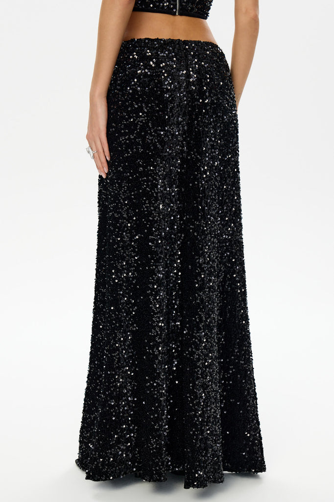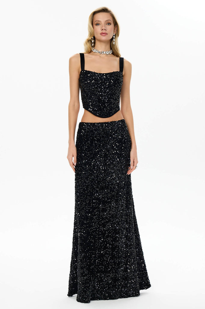 A maxi skirt crafted from luxurious black velvet. The dazzling fabric, adorned with sequins, radiates glamour and opulence. The fitted silhouette gently flares towards the hem, while the low-rise waist elegantly accentuates your figure, creating a feminine and enchanting look. Fastened with a discreet hidden zipper, this skirt is the epitome of understated elegance.
