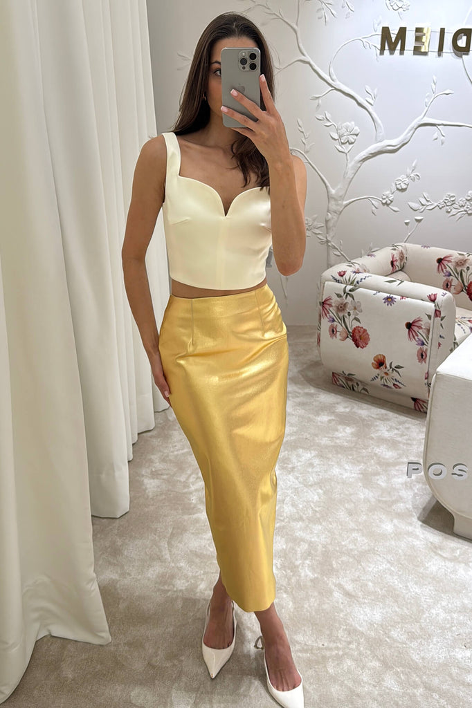 Channel your inner goddess in this sleek maxi skirt crafted from luxurious gold fabric. The body-skimming silhouette hugs your curves, creating a timeless, elegant look. This skirt is the ultimate statement piece, adding a touch of sophistication to any outfit.