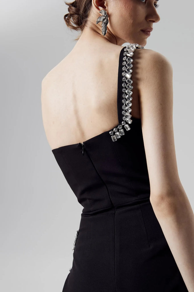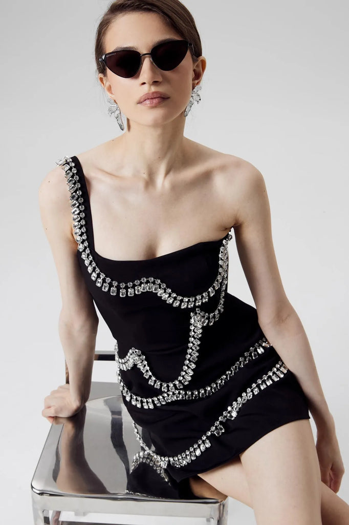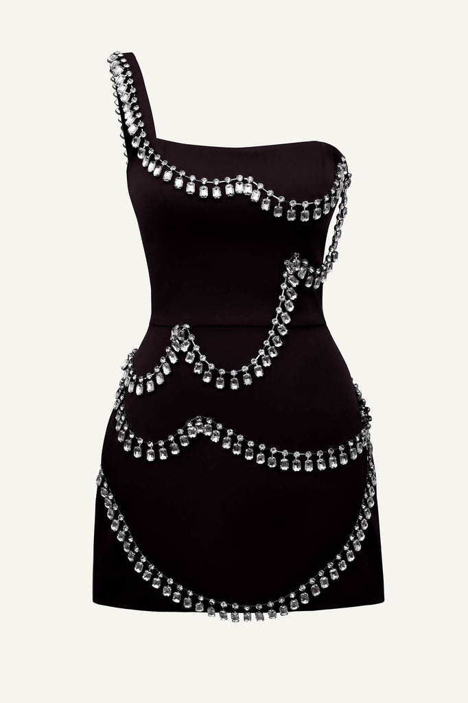 A captivating black gown, sculpted for the evening's most discerning events. Its asymmetric silhouette, daring yet refined, is dramatically embellished with a cascade of oversized crystals, framing the bodice and flowing down the hem. A single, sculpted shoulder strap adds a note of modern defiance, while the figure-hugging, mini-length design ensures a captivatingly glamorous effect.
