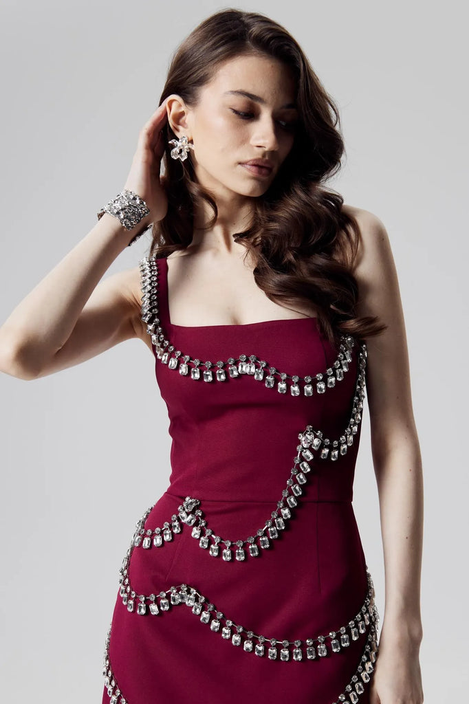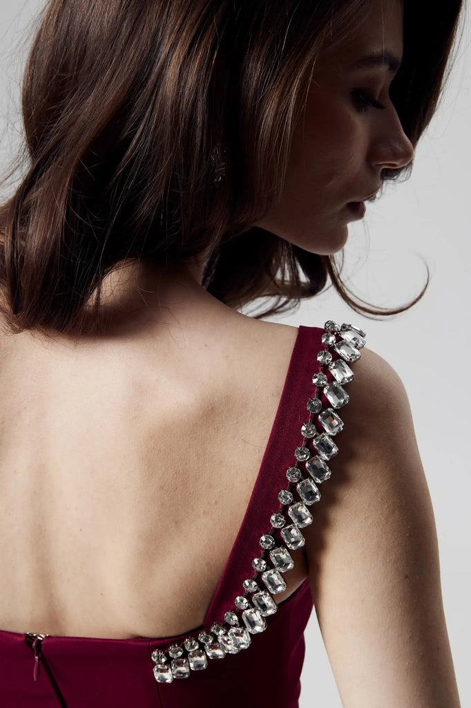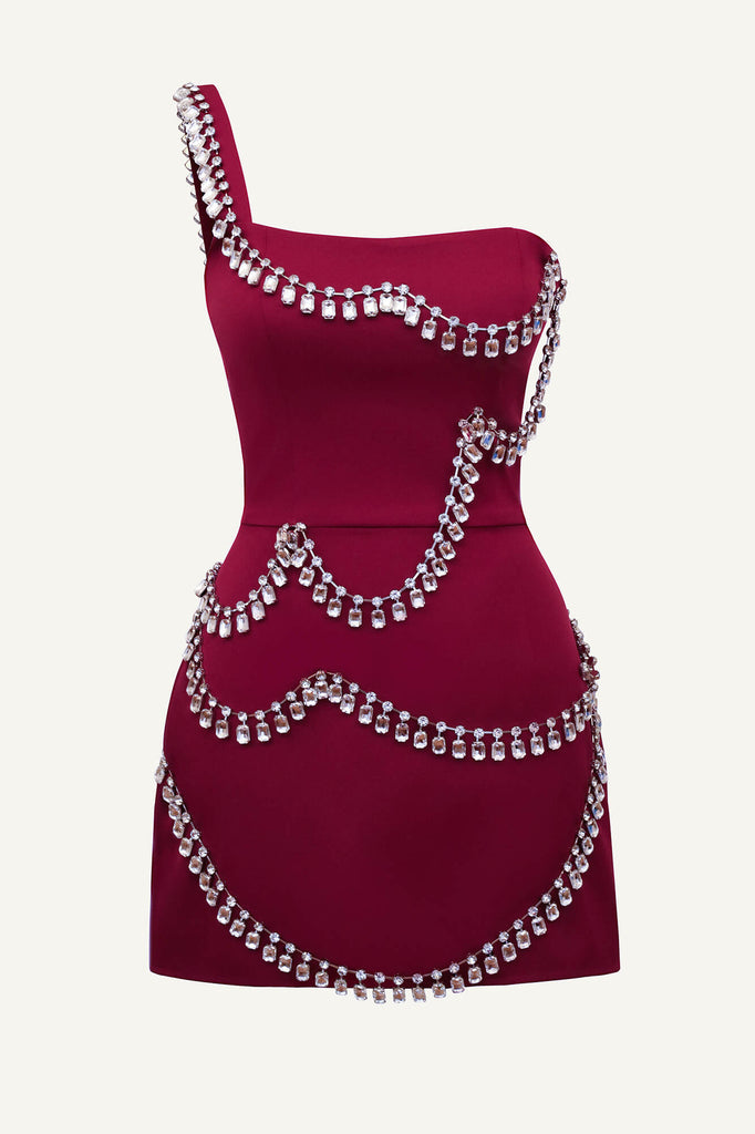A captivating vinous gown, sculpted for the evening's most discerning events. Its asymmetric silhouette, daring yet refined, is dramatically embellished with a cascade of oversized crystals, framing the bodice and flowing down the hem. A single, sculpted shoulder strap adds a note of modern defiance, while the figure-hugging, mini-length design ensures a captivatingly glamorous effect.