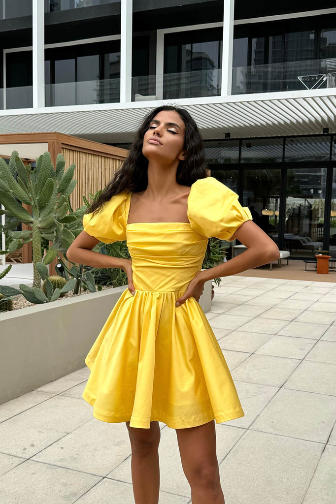 A delicate midi-length dress with the most feminine "godet" silhouette skirt in Yellow. Drapery on the bodice line is designed to ensure your look to be joyful and romantic. The garment has a fitted cut and puffy sleeves. The dress favorably emphasizes the silhouette, tightly fitting the hips, expanding to the bottom. The dress will make you feel the prettiest and good looking ever.