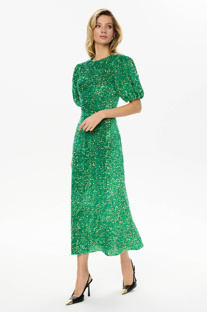 Sequin Decorated Velvet Puff Sleeve Midi Dress