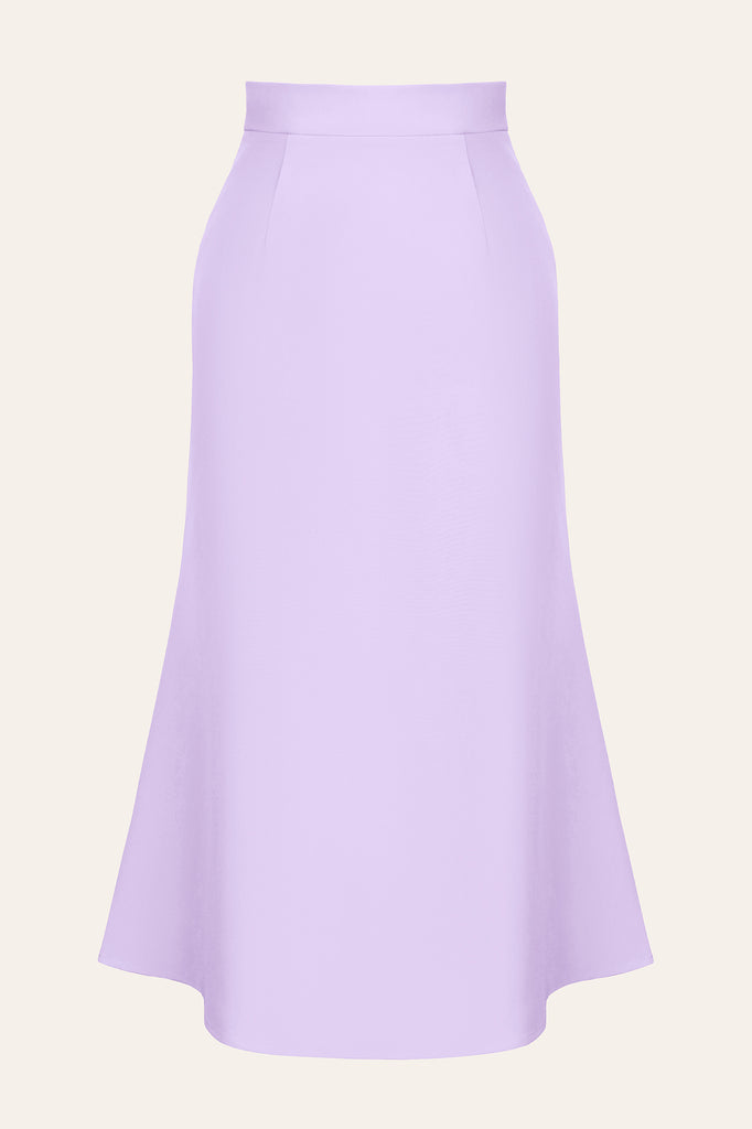 This fitted midi skirt in soft lavender shade is an absolutely charming piece. Lovely silhouette and incredible shade makes this garment so lovely and princess-like. It is made of medium-density viscose that is known for incredible smoothness and softness. The skirt zips up with a hidden zipper. To complete the look, combine it with a matching turtleneck, or with a top from the new collection.