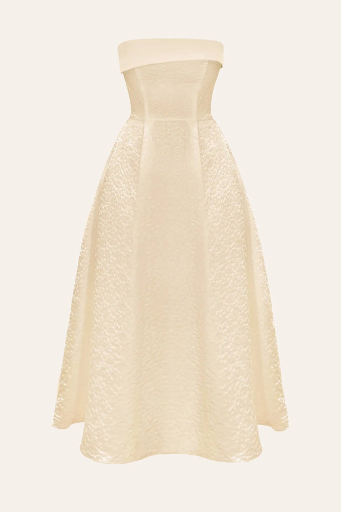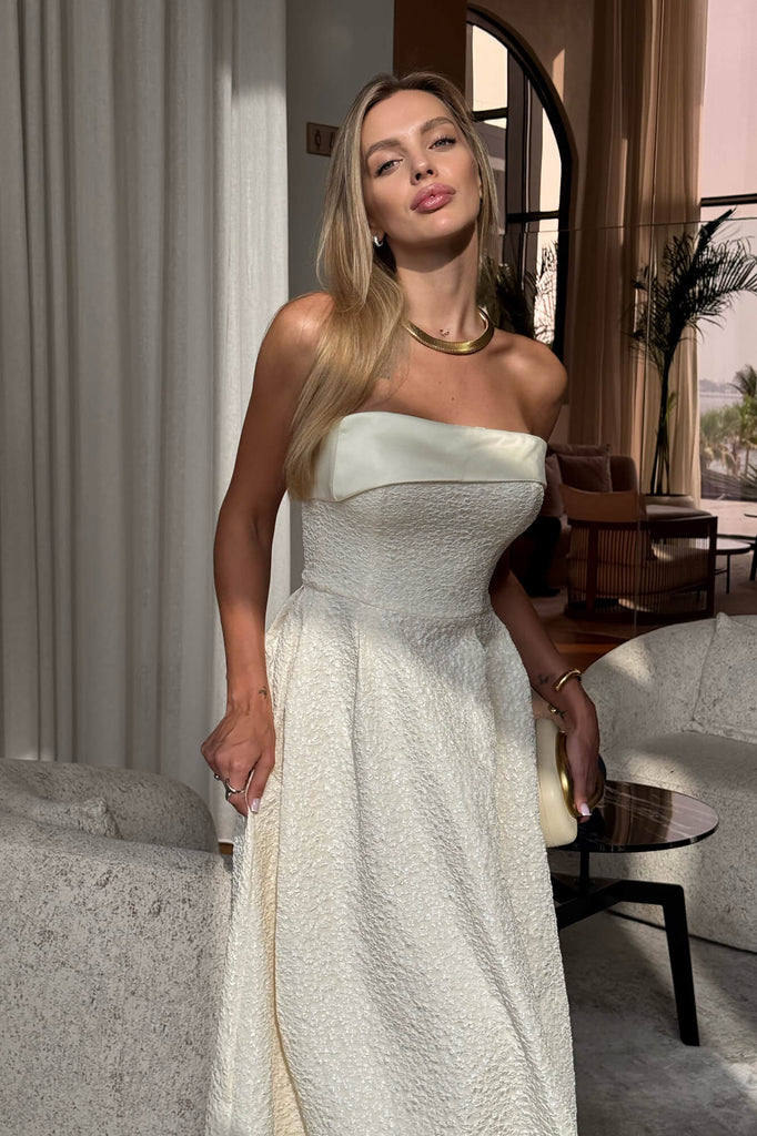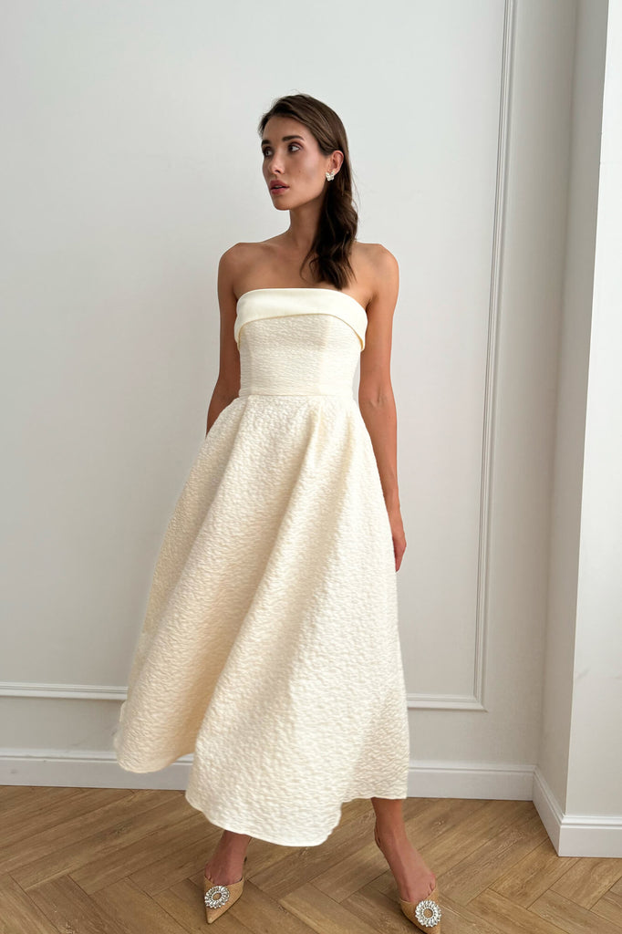 Elegant, absolutely magical delicate dress. Satin turn up emphasizes the elegance of the shoulders line and creates such a romantic appearance. Evening pumps and a clutch will be a great addition.