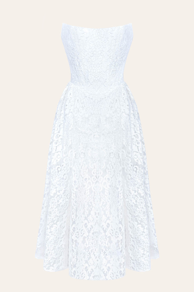 This ethereal midi dress in a soft ivory hue is the epitome of romantic elegance. The sculpted bodice accentuates your curves, creating a graceful silhouette. The deep neckline highlights your collarbone and décolletage, while the delicate lace accents add a touch of vintage charm. This dress whispers of delicate beauty, perfect for a dreamy evening affair.
