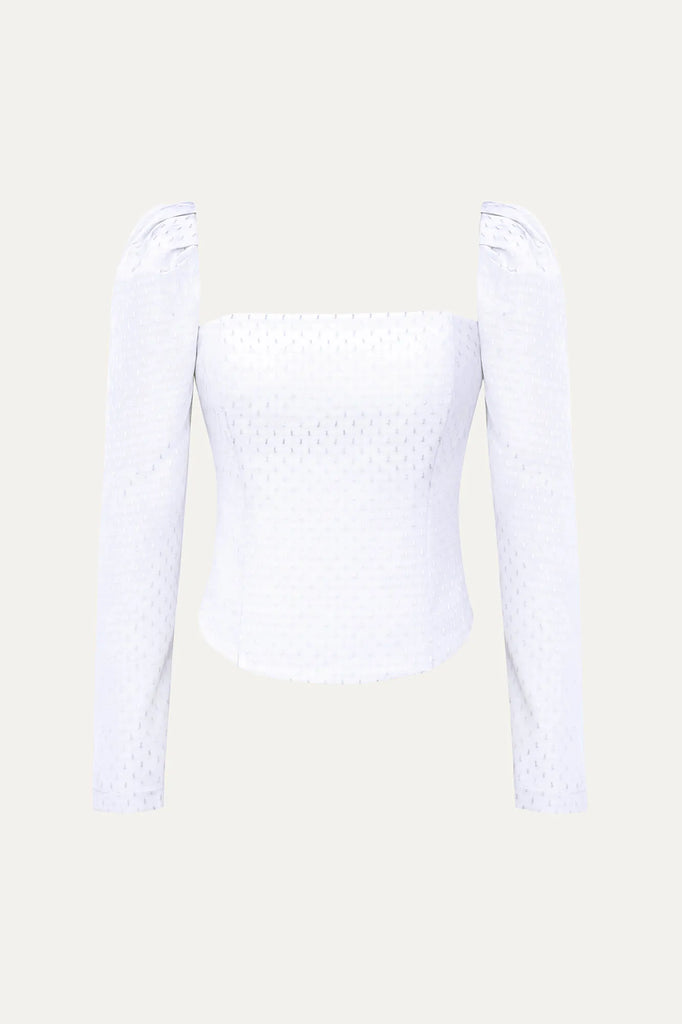 A long sleeve top in Pearl color made of textured viscose. The corset base provides a perfect fit and models the figure and the deep square neckline opens the neck and collarbones. To create a spectacular evening outfit сomplete it with a top from our collection.
