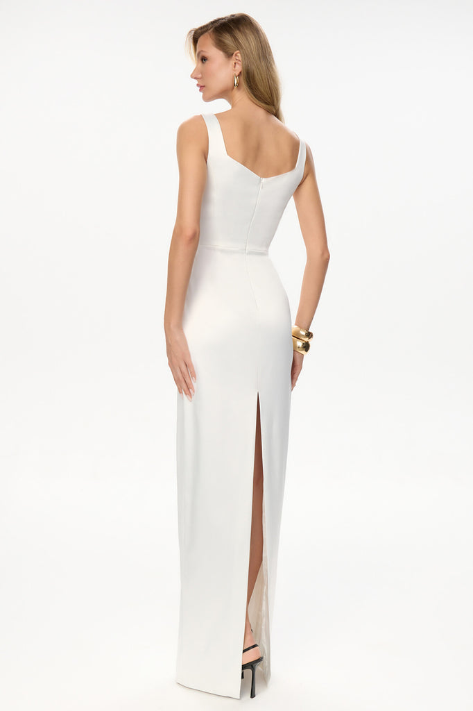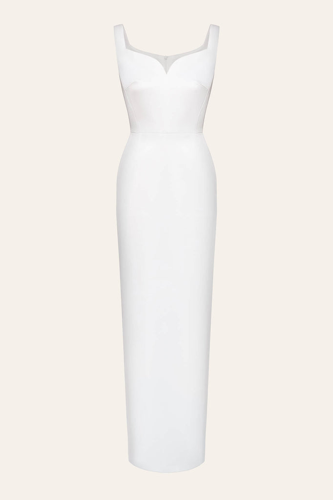 Silhouette of Grace. A classic, milky white maxi dress with a timeless silhouette, this piece is designed for every woman who wants to embrace her feminine side. The wide straps add a touch of elegance, while the subtle slit adds a hint of seduction. The fitted design hugs your curves, showcasing your figure with graceful poise. This dress is a canvas for your own personal style, whether you choose to accessorize it with statement jewelry or keep it simple and sophisticated.