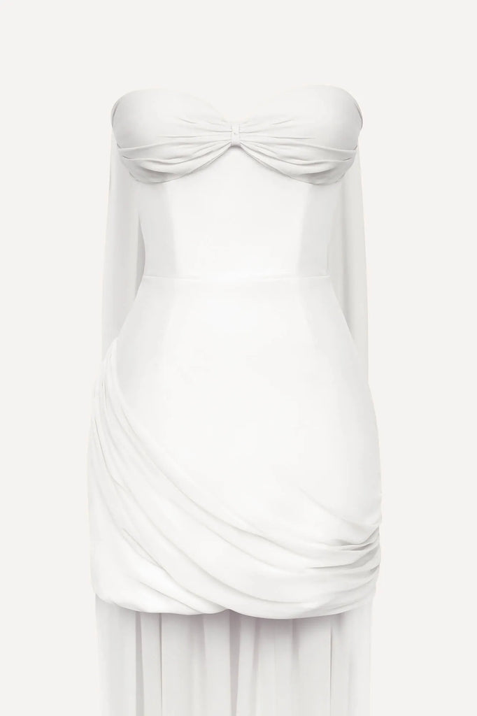 Ultimate bustier dress in mini length with drapery on the cups and skirt with an incredible train on the back. The inner construction of the bodice has soft cups for extra comfort and support. The train of the dress is removed. Lined.
