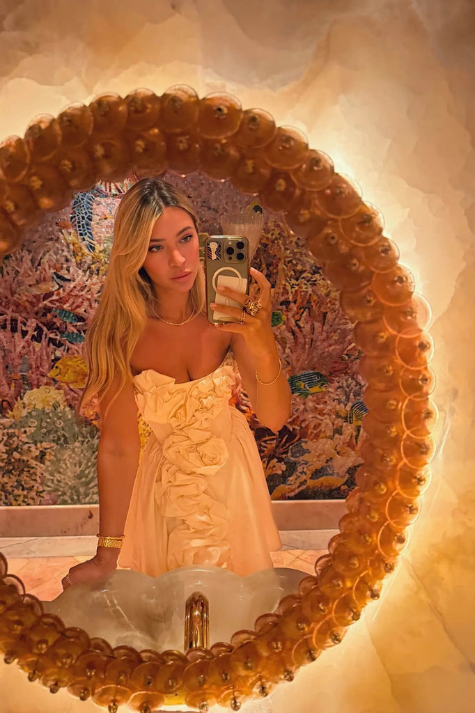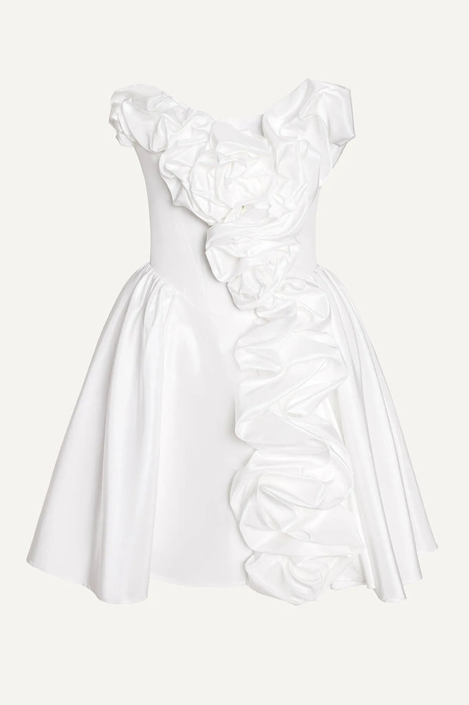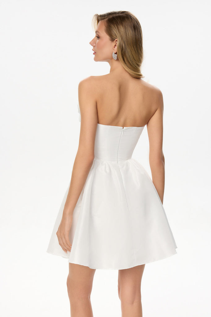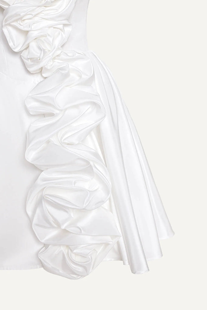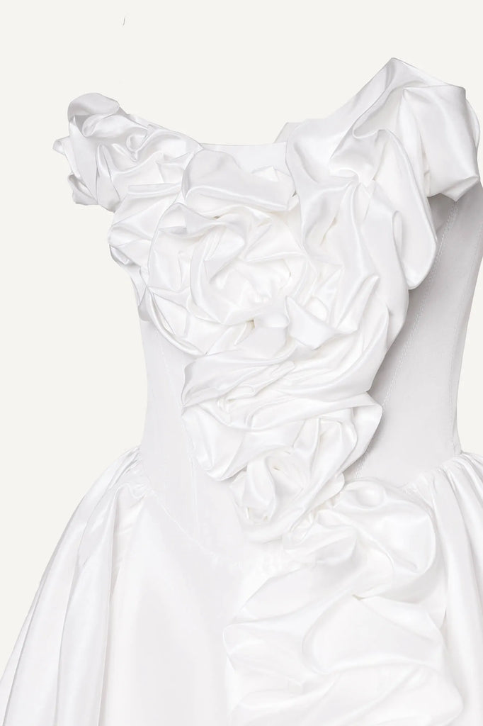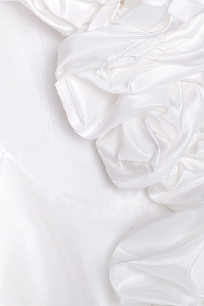 An airy satin bustier dress in a delicate milky shade. Decorative gathers on the bodice and skirt make the look playful and feminine. A soft corset bodice without cups perfectly shapes the figure, emphasizing the neckline and shoulders, and a fluffy mini skirt will allow you to demonstrate all the beauty of your legs. A hidden zipper on the back in the middle seam. A fly-away lining on the skirt.