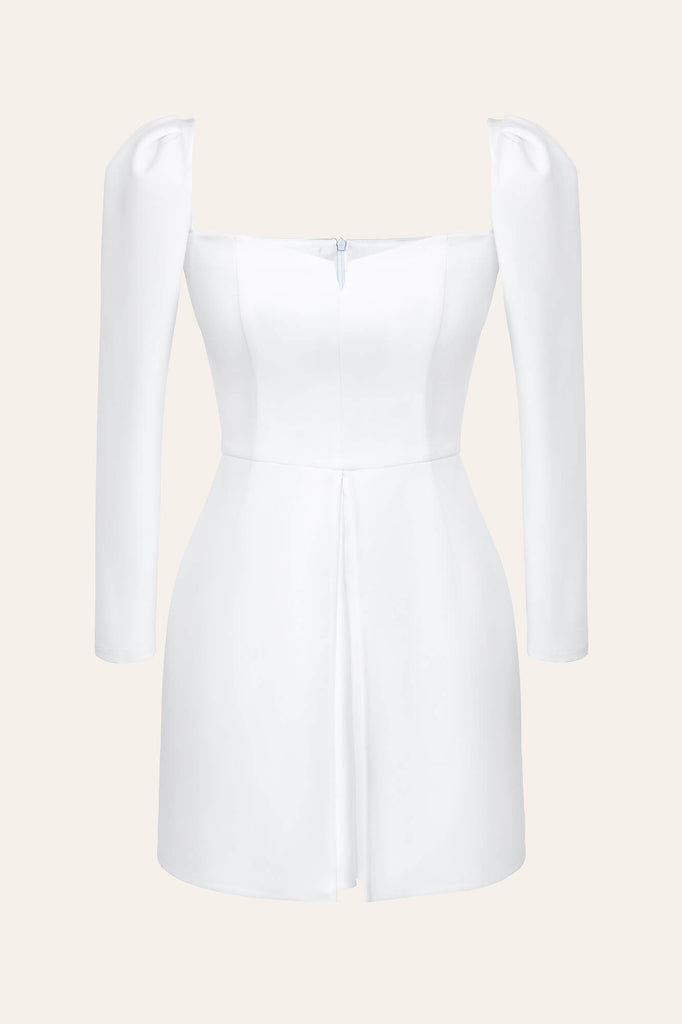 Be playful and joyful in our long sleeve mini dress in milky color. A V-shaped neckline accentuâtes our curves and gives more femininity to the look, and visually elongates the neckline. The fitted silhouette will perfectly emphasize your body lines. The slit in the front and loose skirt will add some playfulness.