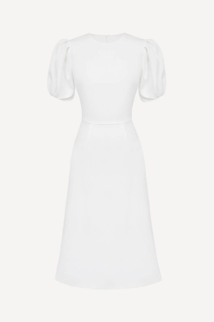 A simple chic midi godet dress in white, an easy go-for option for every occasion. The dress has a fitted cut with a classic round neck and puffy sleeves that flatters rounded, full arms. The dress favorably emphasizes the silhouette, tightly fitting the hips and expanding to the bottom.