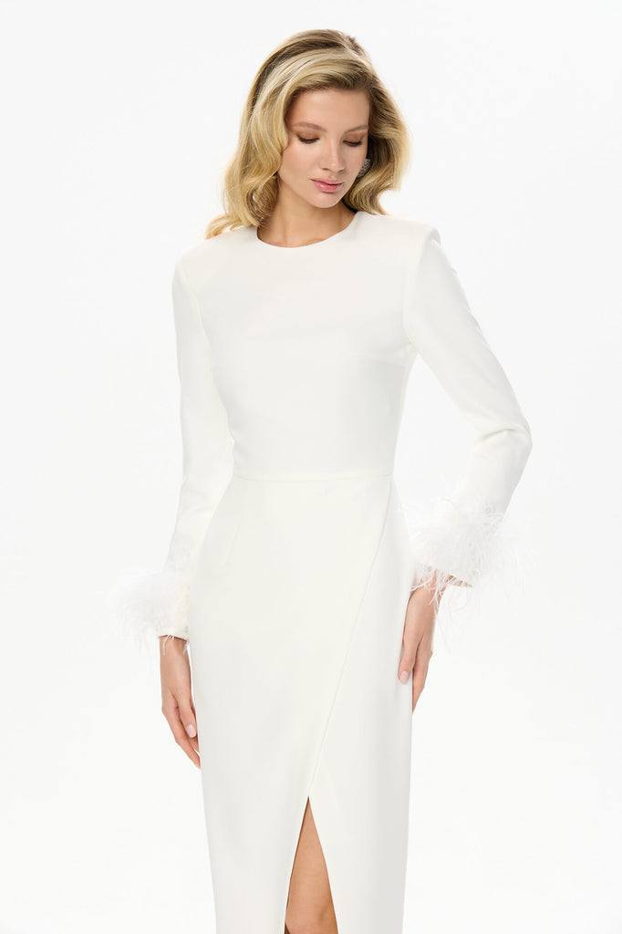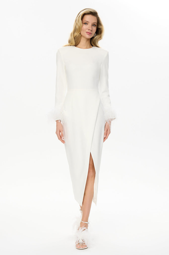 Wrap Feather Sleeve Midi Dress in Milk. The feathers on the sleeves are a special dress detail. The detachable cuffs ensure careful dress use. The wrap silhouette emphasizes the smooth and feminine lines of the body shape. Dense fabric provides a good fit.
