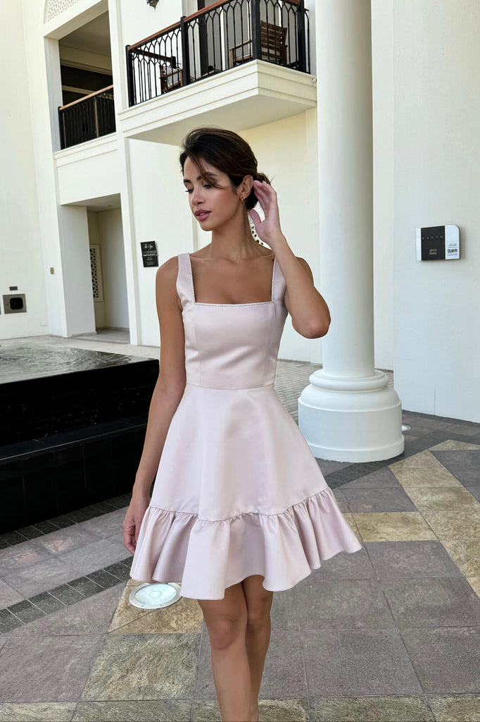 Bouncy, youthful, feminine, glowing - this is what you emit while wearing this mini dress with a flounce at the bottom. While keeping the design of the dress simple and airy chic, we added rhinestones all along the square neckline that is the most flattering for those with elegant small bust. The dress is made of polyester, which does not restrict movement and sits comfortably on the body. A light and airy dress can be matched with minimalistic pumps or sandals.