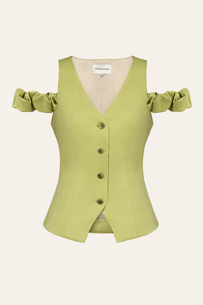 Fitted button-front Vest V-Neck Top. Decorative frills details emphasize the shoulder line and add romance to the appearance.